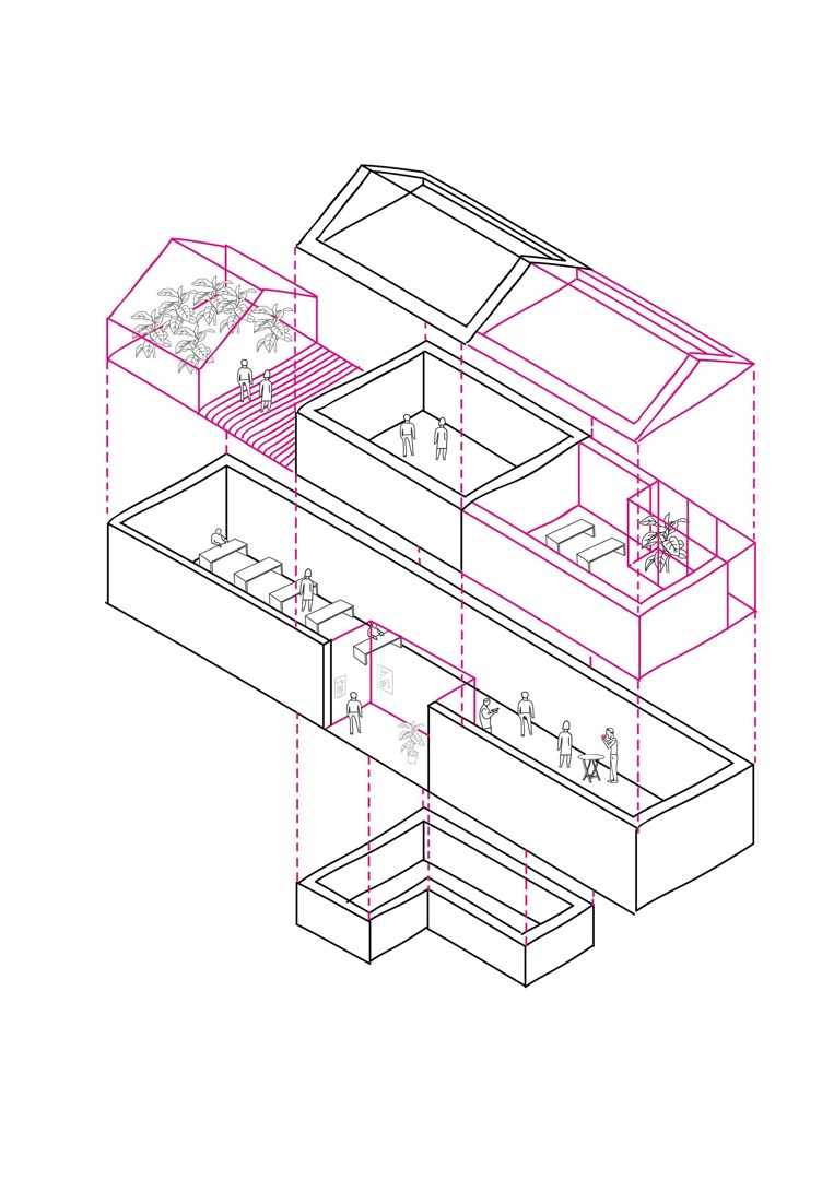 “De enige voorwaarde die ons werd opgelegd, naast enkele eisen rond erfgoed, was dat 50% van het gebouw nog steeds ter beschikking moest staan van de gemeenschap. Daarom voorzagen we in ons plan ook een koffiebar en ontmoetingsruimte. Vervolgens gingen we aankloppen bij archipelago, waarvan de kantoren net als de onze op een boogscheut van het station van Wijgmaal liggen. We besloten de delen die nog rechtstonden te hergebruiken. De delen die ingevallen waren, hebben we verder afgebroken. Daar komt nu een demonteerbare kantoorruimte. Want we wilden, geheel in lijn met onze filosofie, absoluut inzetten op circulair bouwen.”