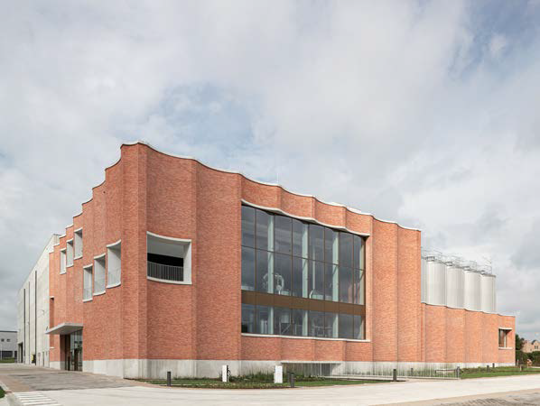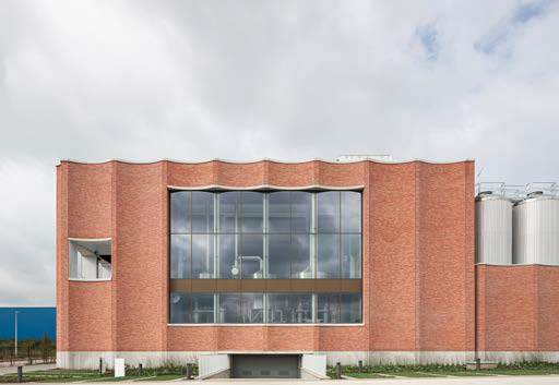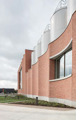 Het verticale concave gebogen metselwerk is een verwijzing naar de curve van de inox brouwtanks. Zo ontstaat er natuurlijk een dialoog tussen het verleden en vandaag, maar ook met de activiteit zelf van het bedrijf. De kracht die vrijkomt door de geometrie van het metselwerk wordt verzacht door de keuze voor een neutrale roodbruine baksteen die een zekere soberheid meebrengt. Het artisanale karakter van deze baksteen, gecombineerd met een uitvoering in wild verband, weerspiegelt met authenticiteit de geest van het project.