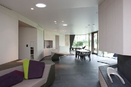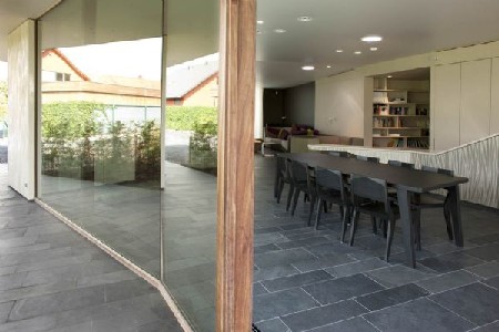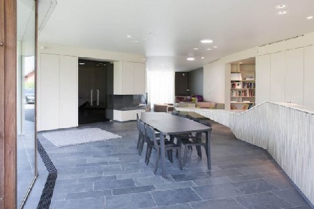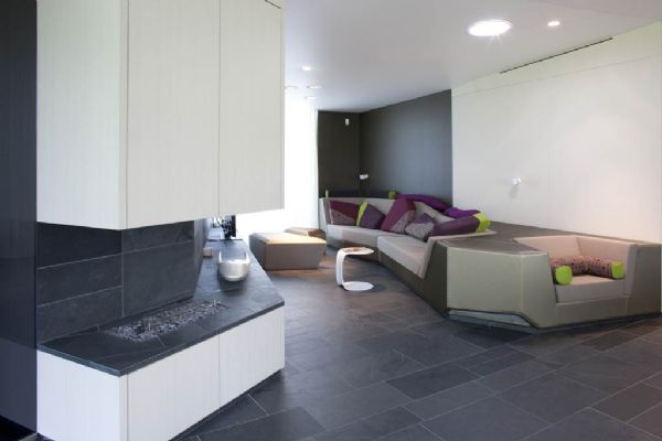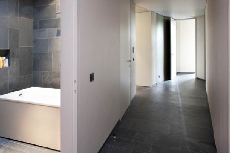 Een voorbeeld verduidelijkt dit principe van ontwerpen. Voor de vloerbekleding in de living werd Braziliaanse leisteen van Beltrami gekozen. Black Slate werd toegepast in een speciaal bandenverband en opnieuw gebruikt in de keuken, badkamer, douche, schouwbekleding en zelfs op het terras.