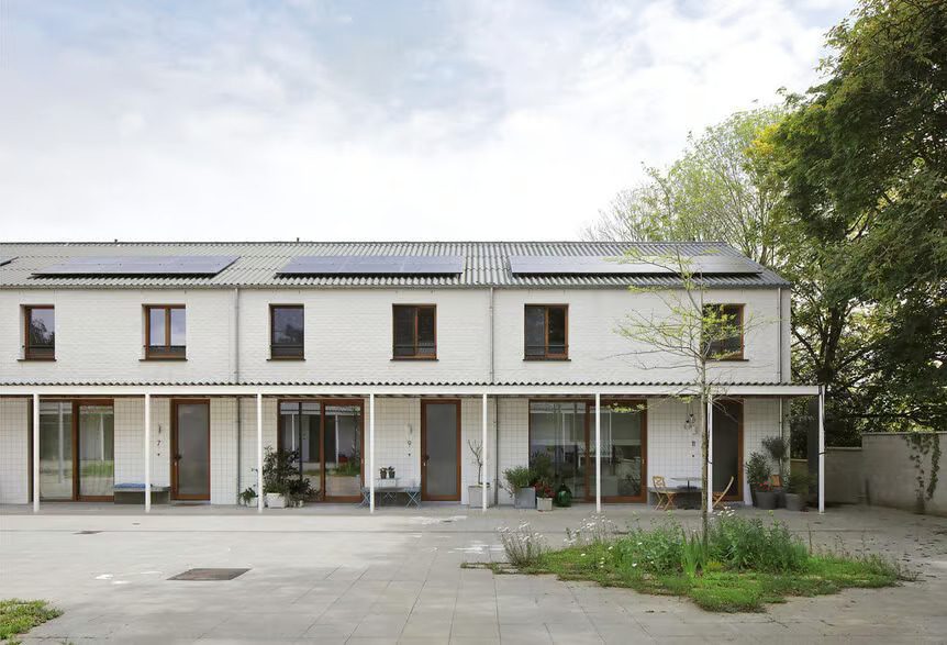 Een cruciaal element in het ontwerp is de nieuwe verbindende luifel aan de woningen langs de kant van het binnenplein. Deze luifel fungeert als een zachte overgang tussen de private woningen en de collectieve speelplaats. Centraal op die koer bevindt zich een buurthuis dat dient als overdekte gemeenschappelijke ruimte voor buurtfeestjes en dergelijke. De materiaalkeuze en detaillering van de nieuwe volumes contrasteren met de baksteenarchitectuur van de gerenoveerde vleugels.