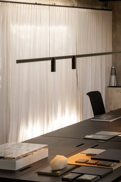 De verlichting is precies afgestemd op technische details zoals kranen en stopcontacten. Een indrukwekkende wand fungeert als kast vol met materiaalsamples, waarbij het verweerde bronzen verlichtingsdetail helpt om items te benadrukken. De kast, die maandelijks nieuwe materiaalsamples toont, fungeert ook als verbindingspunt tussen verschillende zones van het kantoor en wordt geaccentueerd door diverse verlichtingsarmaturen.