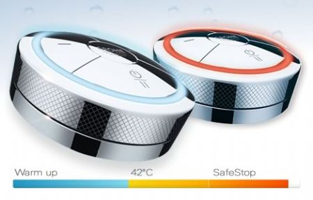 De watertemperatuur kan worden ingesteld met een lichte druk op de plus- of de minknop. De thermostatische technologie verzekert dat de temperatuur van het water behouden blijft, zelfs bij een schommelende waterdruk of -temperatuur. Als de watertemperatuur wordt gewijzigd, geeft de kleur van de lichtring op het digitale bedieningspaneel dat aan (blauw-geel-oranje- rood). Bij een watertemperatuur van 38°C wordt een veiligheidssysteem geactiveerd en gaat er een lampje knipperen om het risico op brandwonden te beperken.