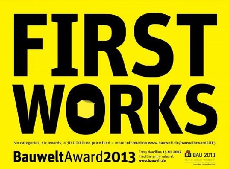 De Bauwelt Prize 2013 is een competitie die openstaat voor architecten en landschapsarchitecten over heel de wereld, zowel individuen als teams. Ze geldt voor alle ‘First Work’ categorieën, van het interieurdesign van winkels en ketens tot prototypische constructies, van publieke woonprojecten tot het herstructureren van een publieke ruimte en tot tijdelijke interventies. De deadline voor inzenden van projecten is 22 oktober 2012.