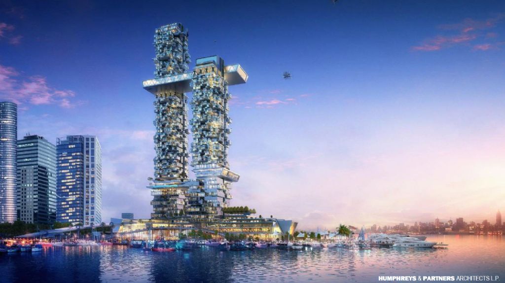 Twee platformen verbinden beide torens met elkaar en bieden plaats aan gemeenschappelijke voorzieningen zoals een zwembad, fitness, wellnesscentra, restaurants en landingsplekken voor drones.