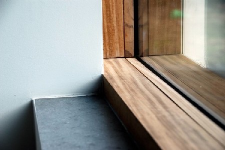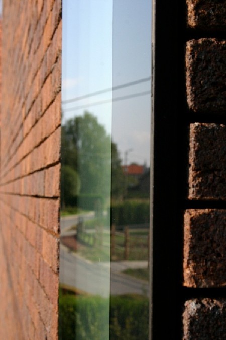 Voor een woning in Blanden maakten Benjamin Denef en Matthias Mattelaer van DMOA een bijzonder raamontwerp dat ze met de naam "postzegelraam" doopten. Tijdens de zoektocht naar een oplossing om de elegantie van een bakstenen volume maximaal te behouden, werd een raam ontwikkeld dat het effect heeft van een postzegel op een oppervlak. Perforaties worden daardoor schijnbaar vermeden en het volume wordt er extra door versterkt. Er ontstaan visueel scherpe lijnen tussen baksteen en glas. Bij enkele ramen werd dit principe zelfs tot op de hoek van de gevels getrokken. Een baksteen in verstek met het raam. Kenmerkend is vooral dat raam en gevel in hetzelfde vlak liggen en er aan buitenzijde geen profielen zichtbaar zijn. Aan de binnenzijde zijn de ramen dan weer heel uitgesproken. De leuke natuurzichten worden stevig omlijst door een eenvoudig afrormosia blokkader. Het geeft warmte en klasse aan het interieur. Elk raam lijkt een goed gepositioneerd schilderij op de muur. Het vernieuwende en de belangrijkste troef van dit unieke raamconcept is de akoestische en energetische performantie ondanks de zeer fijne detaillering. Het montageconcept is als principe inzetbaar in woningen waar heel hoge energetische vereisten zijn en het glas is eenvoudig te vervangen bij breuk door de onzichtbare mechanische bevestiging.