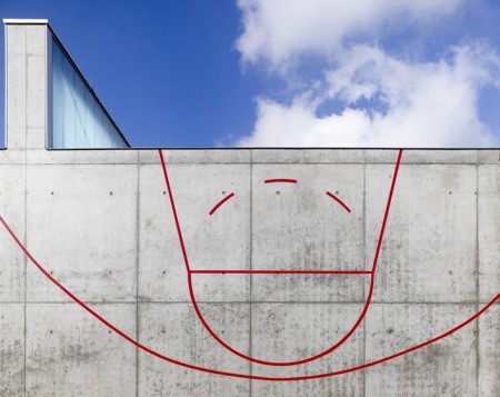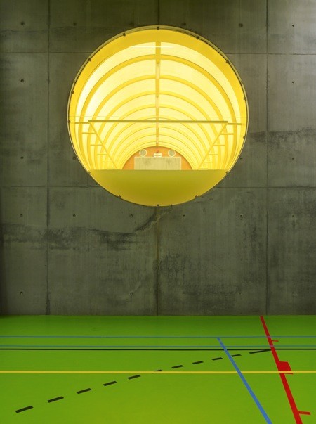 Kenmerkend voor de site waren het hellende terrein, de grote diversiteit van gebouwtypologiën op de campus en het schaalverschil van de gebouwen. Inspelend op zijn omgeving werd het compacte bouwvolume verzonken in het talud ingeplant. De sporthal vormt alzo een geleidelijke overgang tussen het grootschalige schoolgebouw en het belendende kleuterpaviljoenen. De sporthal opgetrokken in gewapend beton met sportveldbelijning werd opgevat als een ‘doe-gebouw’. Een gebouw als soccer-wall, climbing wall,…