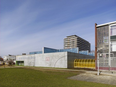 speelplaatsen en vanaf de straat. Tenslotte moest er ook rekening gehouden worden met het feit dat het gebouw op een hellend terrein kwam te staan.