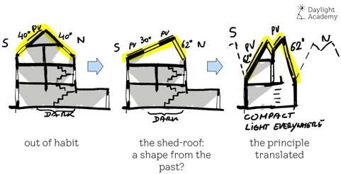 De som is snel gemaakt: licht in het midden kan men enkel via het dak verkrijgen die het via vides centraal laten aanleveren. Verder wil men absoluut geen oververhitting: kortom, de reflex is nu om aan de maximale stand van de zon te denken (in België een sheddak met helling van 62° naar het noorden). Wat men met het zuiden doet qua vorm heeft geen belang. In dat noord-kijkend vlak kan men zoveel openingen als gewenst plaatsen zonder oververhitting te ondervinden.