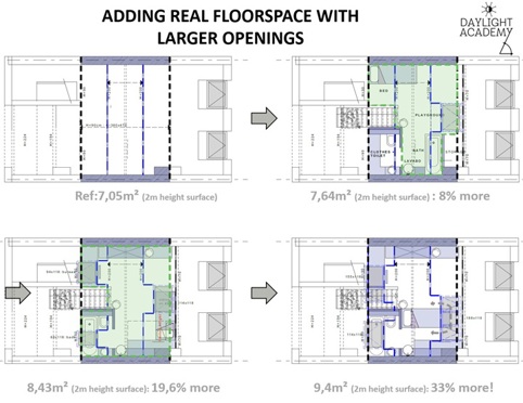 In deze kleine zolder met maar 7m² vloeroppervlakte met 2m hoogte en meer, zorgen 3 zorgvuldig geplaatste openingen in een dik dak (met 50 cm horizontale meerruimte in de dikte) dat men 33% meer vloeroppervlakte met 2m vrije hoogte heeft! Dat is 1/3 van de initiële vloeroppervlakte bij. Een ruimte die anders te klein is om als bewoonbaar verklaard te worden voldoet nu wel! (in dit geval moest men stedenbouwkundig 9m² vloeroppervlakte hebben met een vrije hoogte van 150 cm “ref RRU Brussel”)