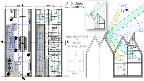 Resultaat: een rijhuis: heel diep maar vol licht (overal DF 2(300lux) of hoger), zonder oververhitting, een nieuwe indeling: kortom een ander huis dan men gewend is, vol levenskwaliteit, op een kleine oppervlakte gebouwd, goedkoop qua structuur. Dit allemaal enkel mogelijk door de vorm van het dak als uitgangspunt te nemen.