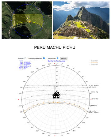 1) Machu Pichu blijkt recht op de evenaar te zitten met zomerzon aan de noordkant op 55° en winters aan de zuidkant op 80°.