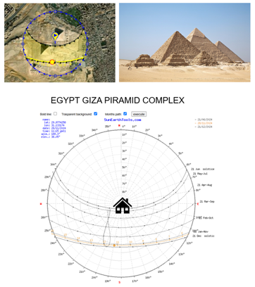 2) De piramiden van Gizeh, die zitten nog steeds in het noordelijk halfrond (zoals België: dus met zon in het Zuiden in de zomer) maar daar valt op dat de zon op 21 juni pal verticaal op 90° boven de piramiden staat. Daarom dat als men in de zomer naar de piramides gaat kijken (waarschijnlijk tegen de middag) , dat er geen schaduw is