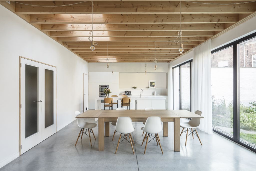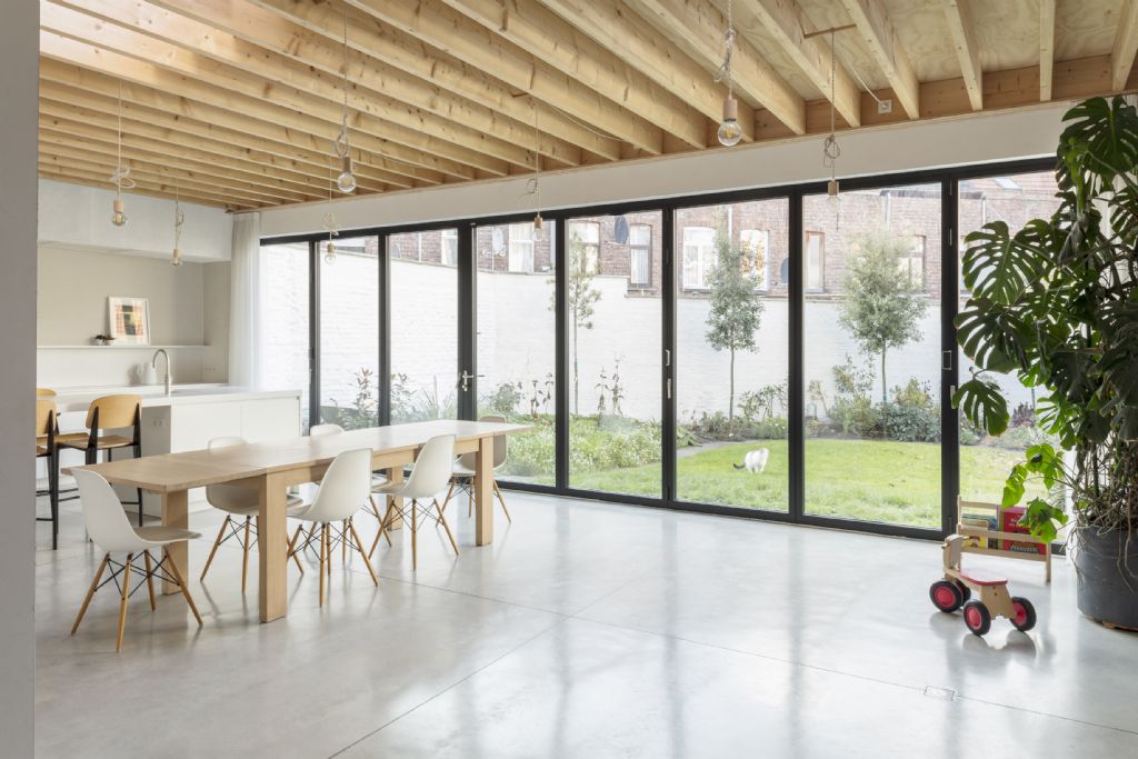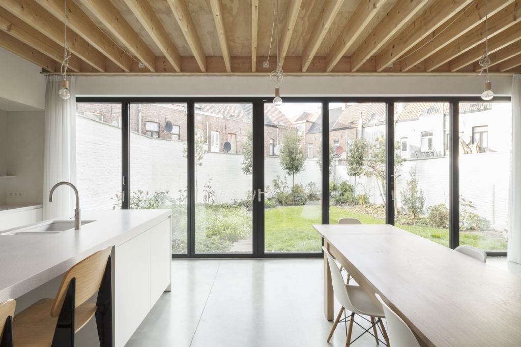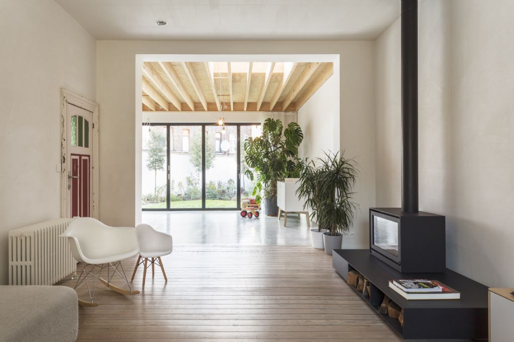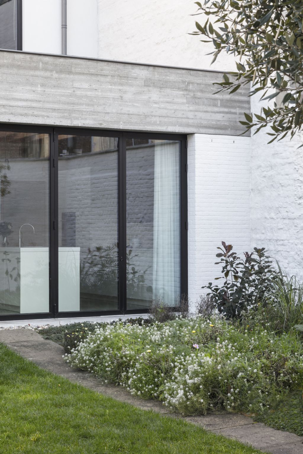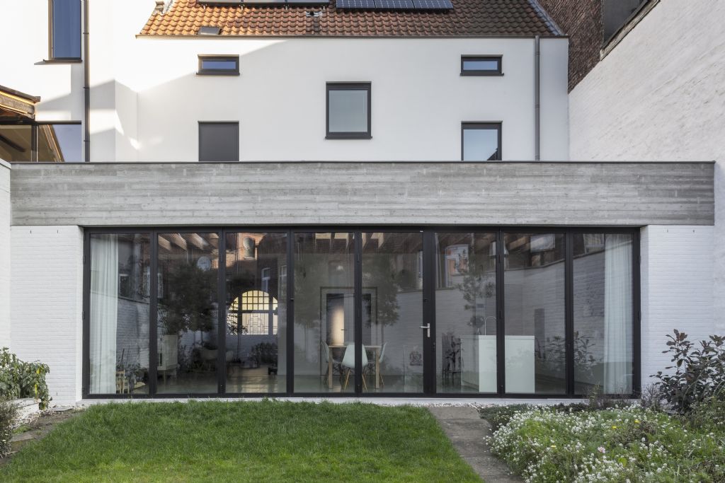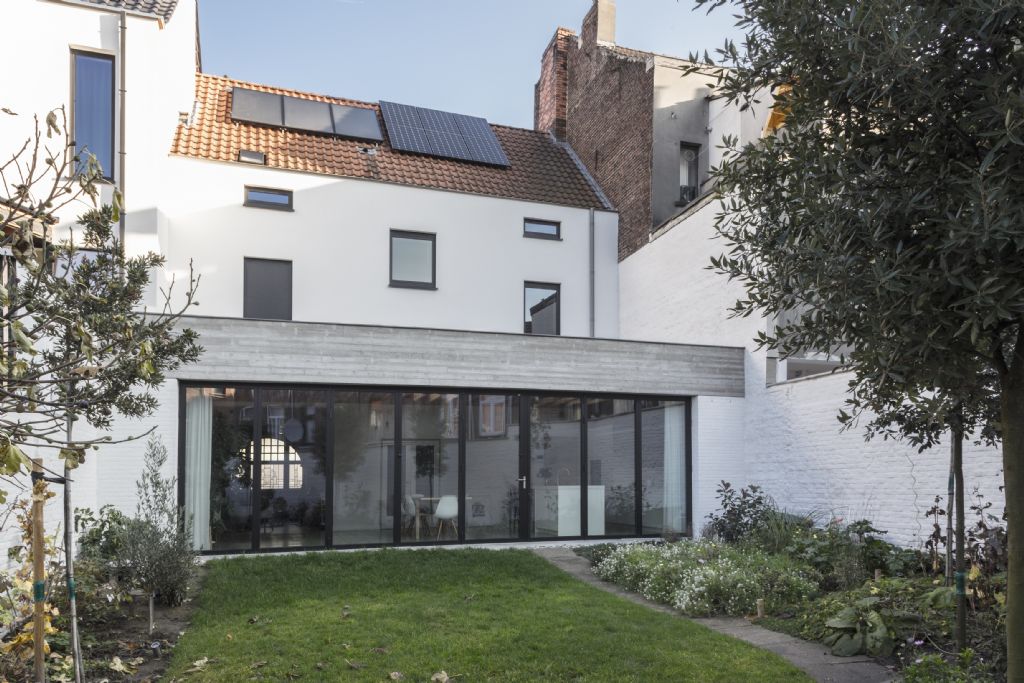 De planindeling na de verbouwingswerken houdt rekening met de mogelijkheid tot het kunnen vestigen van een vrij beroep doordat de voorkamers van de meest linkse travee ingezet kunnen worden als ontvangstruimte / kantoor. De uitbreiding blijft compact, structureel eenvoudig en er ontstaat een maximaal zicht op de tuin met een optimale lichtinval. Door de uitbreiding achteraan wordt de woning opnieuw de mooie burgerwoning van weleer met hoge plafonds, ruime vertrekken en mooie lichtinval. De uitbreiding dringt zich niet op naar buiten toe, maar wordt eenvoudig vormgegeven in een bescheiden materialenpalet bestaande uit recuperatiemetselwerk en een zichtbaar blijvende met plankjes bekiste en ter plaatse gestorte betonnen balk die voor een geleding in de achtergevel zorgt. Het dak bestaat uit een zichtbaar blijvende houten roostering. Alle dragende onderdelen zijn dus zichtbaar waardoor er een krachtige expressie ontstaat. De penanten waar de balk op rust werden mee gekaleid met de tuinmuren, waardoor het geheel opgaat in de bestaande context van de ommuurde stadstuin, die op ruimere schaal gelezen kan worden als groene patio in het bouwblok.