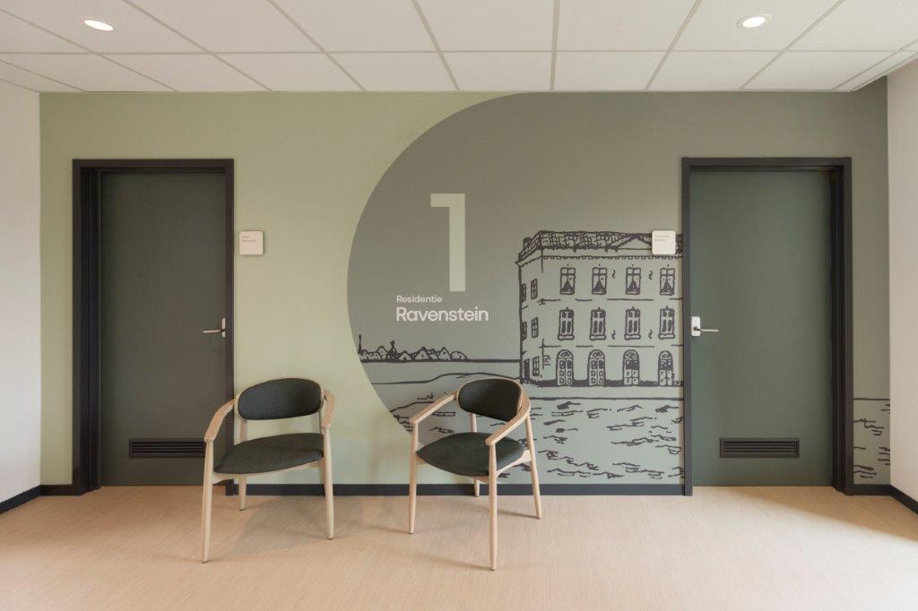 "Drie typerende tinten – bruinrood op het gelijkvloers, groen op de eerste verdieping en blauw op de tweede verdieping – keren niet alleen terug in gemeenschappelijke zones zoals de dagzalen en de collectieve badkamers, maar ook ter hoogte van de kamerdeuren. Deze zijn tevens uitgerust met een fraai lampje en naamkaartje, zodat er als het ware aparte adresjes ontstaan. Niet evident, want het doelpubliek vereist tegelijk ook voldoende contrast voor slechtzienden. Zo lijnen donkere deurkaders en plinten alles scherp af en zijn de donkere sanitaire cellen uitgerust met witte accessoires. Ook het losse meubilair van moments furniture is volledig uitgevoerd in het kleurenpalet dat we voor ogen hadden.”