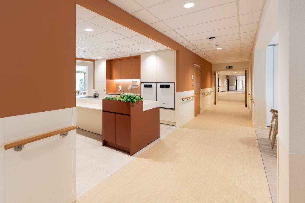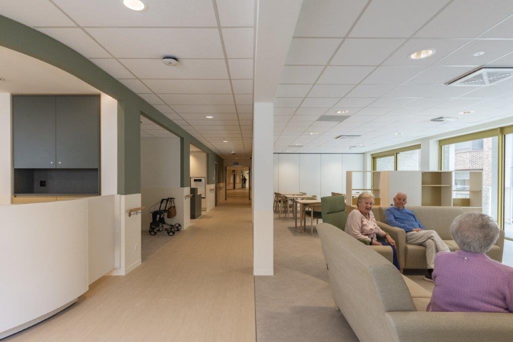 "De ruimtelijke indeling is dus volledig geënt op kleinschalig wonen, zonder dat dit zich vertaalt in lange loopafstanden en nood aan extra personeel. Bovendien zijn de technieken flexibel vormgegeven en kan de inrichting probleemloos aangepast worden, bijvoorbeeld door het zit- en eetgedeelte in de dagzalen van plaats te wisselen. Vermits de ontwerpwedstrijd ten tijde van de coronacrisis werd uitgeschreven, is ons ontwerp tevens ‘pandemieproof’. Zo kunnen de tien kamers aan het uiteinde van het L-volume van fase 1 indien nodig snel en efficiënt in quarantaine geplaatst worden