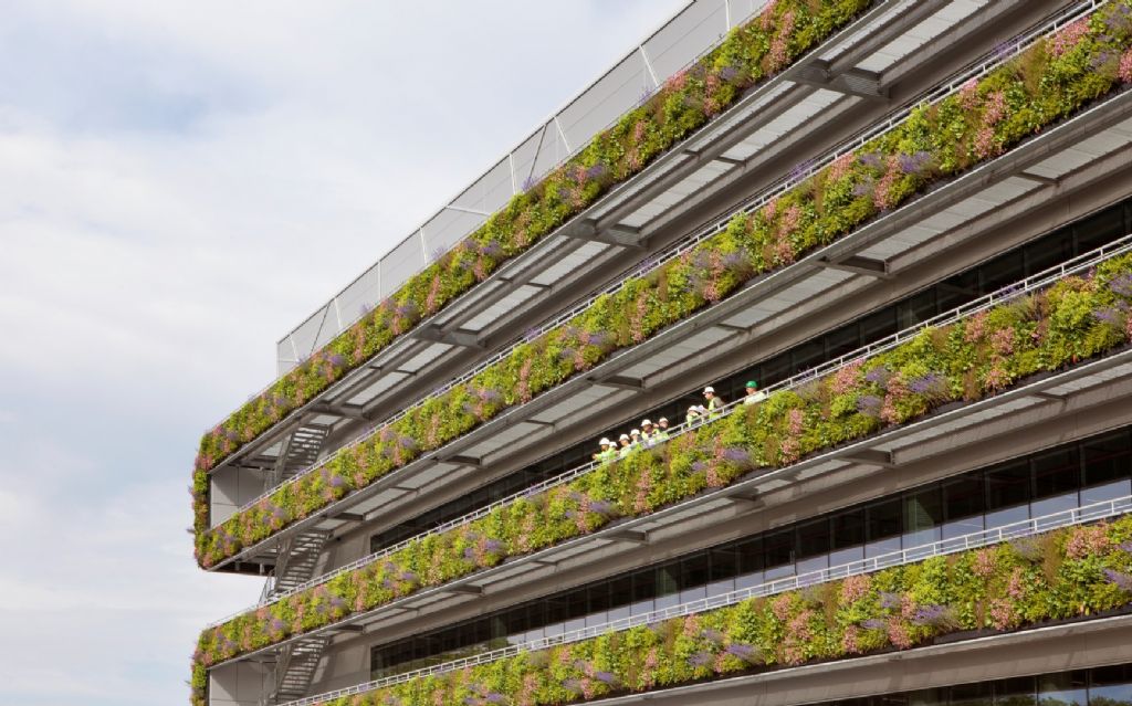 Visueel komt de ecologische filosofie van NIKE ook tot uiting in de enorme groene gevel die de westkant van het nieuwe complex siert en ingekaderd wordt door afgeronde gevelelementen uit aluminium. De gevel slingert als een slang langs de verschillende plateaus en wordt gedragen door de uitkragende balkons op elk niveau. Alles bij elkaar telt hij 1,3 kilometer natuur (ofwel zo’n 3.000 vierkante meter), waardoor hij een van de langste groene gevels ter wereld is. “Die constructie met uitkragende balkons heeft nog meer voordelen”, stipt Donné aan. “Ze dragen niet enkel de gevel, maar dienen ook als buitenruimte voor het personeel. Ze fungeren bovendien als evacuatieweg voor de werknemers en efficiënte zonwering voor de beglazing. Dat zorgt voor veel daglicht, maar een beperkte zoninval.”