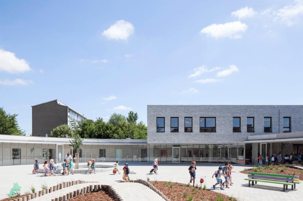 Basisschool Merlijn bevindt zich op een groen, achterliggend perceel en is omringd door enkele grote solitaire gebouwen, waaronder een muziek- en tekenacademie, een school voor leerlingen met een autismespectrumstoornis, een sporthal en een centrum voor volwassenenonderwijs. Deze specifieke ‘centrale’ inplanting had een grote impact op het ontwerp, vertelt Tom Hindryckx, architect-vennoot bij LOW architecten: “We hadden een geheel met een sterke expressie voor ogen – vandaar de opvallende combinatie van een ‘alzijdige’ gelijkvloerse cirkel met hoogteaccent en een strak rechthoekig volume met twee bouwlagen. Bovendien hebben we ervoor gekozen om de speelplaats niet naast, maar in het hart van de school te positioneren, om zo een zekere geborgenheid te garanderen ten opzichte van de omliggende programma’s. Voor jonge kinderen, die vaak ietwat onwennig aan hun onderwijscarrière beginnen, is dat zeker geen overbodige luxe.”