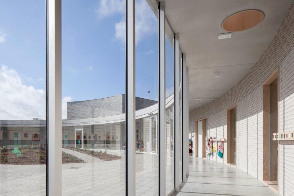 De cirkel met de kleuterklassen wordt geflankeerd door een uiterst transparante (buiten)gang, die aan de kant van de speelplaats volledig beglaasd is. “Het is voor kleuters immers enorm belangrijk dat ze zich op een intuïtieve manier kunnen oriënteren en dat ze snel hun weg vinden. In basisschool Merlijn zien ze vanop de speelplaats waar hun klasje zich bevindt, waar hun jasje hangt, enzovoort. Dat biedt hen de nodige rust en structuur. De specifieke ruimtelijke programmering voelt ook voor de juffen bijzonder fijn aan en laat een prima sociale controle toe. De gang mondt ter hoogte van de inkom uit in een bescheiden foyer van 200 m² (op schaal van de kleuters) en takt eveneens aan op de polyvalente zaal, die is ondergebracht in een hoger achterliggend volume”, aldus Tom Hindryckx.