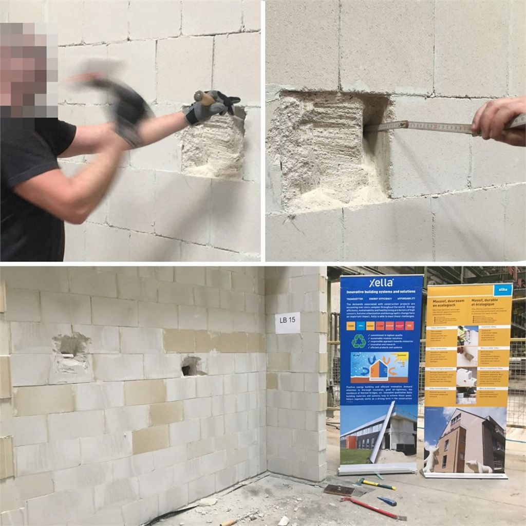 Toegegeven, er was enige nervositeit de ochtend van de test. Twee stevige kerels naderden de testopstelling, uitgerust met hamer, breekijzer en beitels. De fysieke weerstandtest bestond eruit dat ze met dit gereedschap gedurende een bepaalde tijd een Silka muur te lijf gaan. Hierna mogen ze er niet in slagen om een rechthoekig vlak van 160 x 260 mm loodrecht door de muur te steken.
