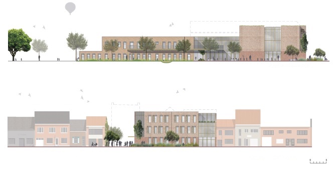 Cuypers en Q architecten benut het bestaande patrimonium in zijn ontwerp, waarvoor het samenwerkte met studiebureaus TECON groep, maximaal en vult het aan met een nieuwbouw die een bestaand gebouw aan de straatkant vervangt. Dat nieuwe hoofdgebouw, met voornamelijk klassen, wordt opgetrokken in roodbruine baksteen. Vliesgevels met houten keperwerk creëren een zachte overgang tussen de nieuwbouw en de lagere bebouwing in de straat. Het beglaasde volume aan de rechterkant van de nieuwbouw – wanneer je naar de nieuwbouw kijkt – vormt de schakel met de bestaande bebouwing rond het plein en bevat verschillende administratieve en overlegruimtes. Het volume maakt tevens de verbinding met de achterliggende bestaande sporthal en met de kleutervleugel, die op zijn beurt een aanbouw krijgt voor een extra kleuterklas en bewegingsruimte. Op de aanbouw komt ook een dakspeelplaats, zodat de kleuters het achterliggende open landschap vanop hoogte kunnen beleven. Achteraan de dreef naast de school zal een begroende luifel ervoor zorgen dat de fietsen droog kunnen worden gestald. Ten slotte wordt de verharding van het plein doorgetrokken naar de school, zodat het plein en de speelplaats in elkaar overvloeien.