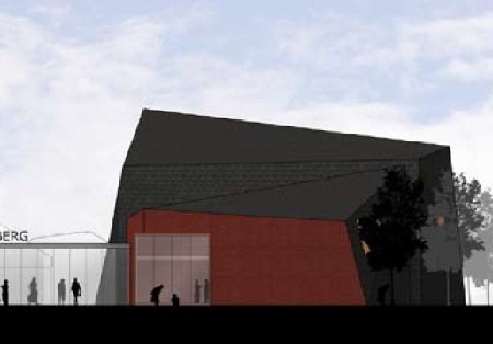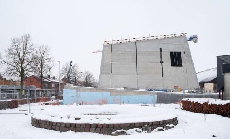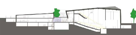 roest-bruin-grijze natuurstenen leien. Een volledig beglaasde foyer verbindt het oude cultuurcentrum