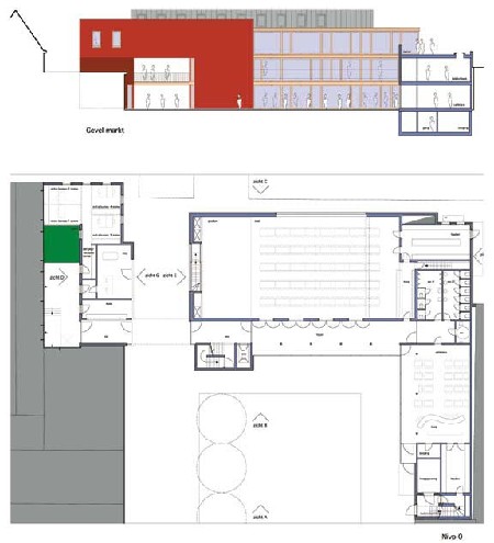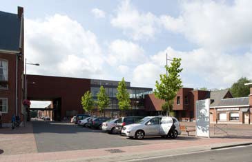 publieke ruimte. Door zijn inplanting heeft het een plein gevormd in een dorp dat voordien geen echt plein had. En dat plein loopt bovendien haast spontaan door tot in het nieuwe gebouw. Het gebouw is letterlijk doorwaadbaar. De straat loopt er gewoon door. Omgekeerd loopt het gebouw ook door in het plein. De foyer, eigenlijk een extra brede gang waar de grote zaal op het gelijkvloers op uitgeeft, heeft extra brede glazen deuren die uitgeven op het nieuwe plein.