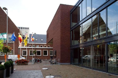 Echter nog niet) bijkletsen rond diverse tafeltjes. De rechterbovenhoek van het gebouw is een glazen doorkijkdoos. Burgers zijn hier als het ware als acteurs die figureren op het plein. Beneden in de zijvleugel tenslotte is bovendien een café gehuisvest. Ook daardoor vormt het plein een uitnodigend en levendig terras, een ‘markt’.