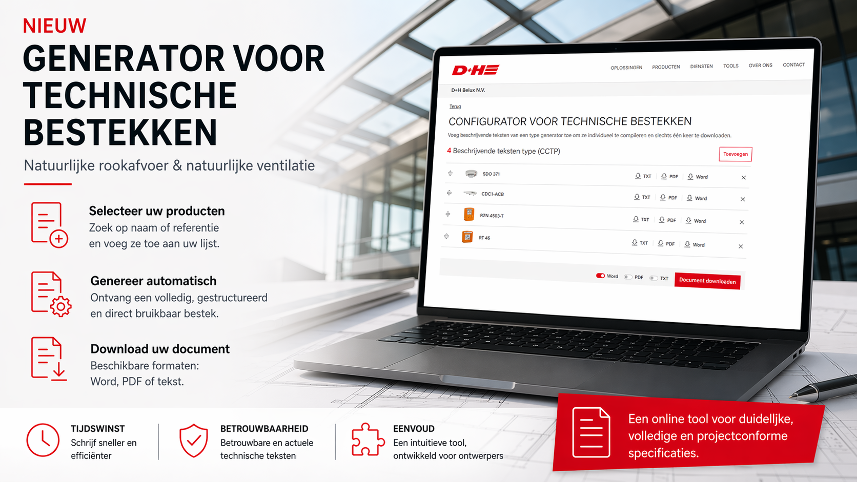 Bij elk bouwproject vormt het bestek een essentieel document om de communicatie tussen de bouwheer, de architect, de aannemer en de leveranciers te coördineren. Door steeds strengere technische en wettelijke eisen wordt het opstellen van deze documenten echter steeds complexer. Daarom stelt D+H, specialist in oplossingen voor rook- en warmteafvoer en natuurlijke ventilatie, een bestekgenerator ter beschikking.