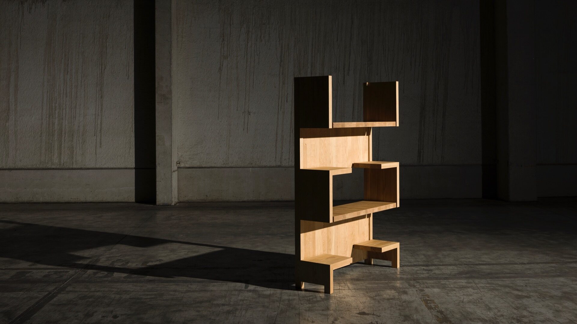 Voor dit ontwerp ging Casimir uit van een rek zonder planken. De planken worden uit verticale zij- en achteroppervlakken gesneden en vervolgens origami-gewijs in horizontale planken gevouwen. Het resultaat is een opvallend frivole, open kast die - hoewel gemaakt van volledig Europese eik - er licht en sculpturaal uitziet en vanwege zijn speelse vorm referenties oproept naar de Carlton cupboard van Ettore Sottsass.