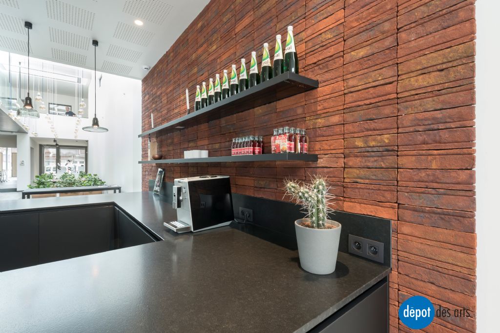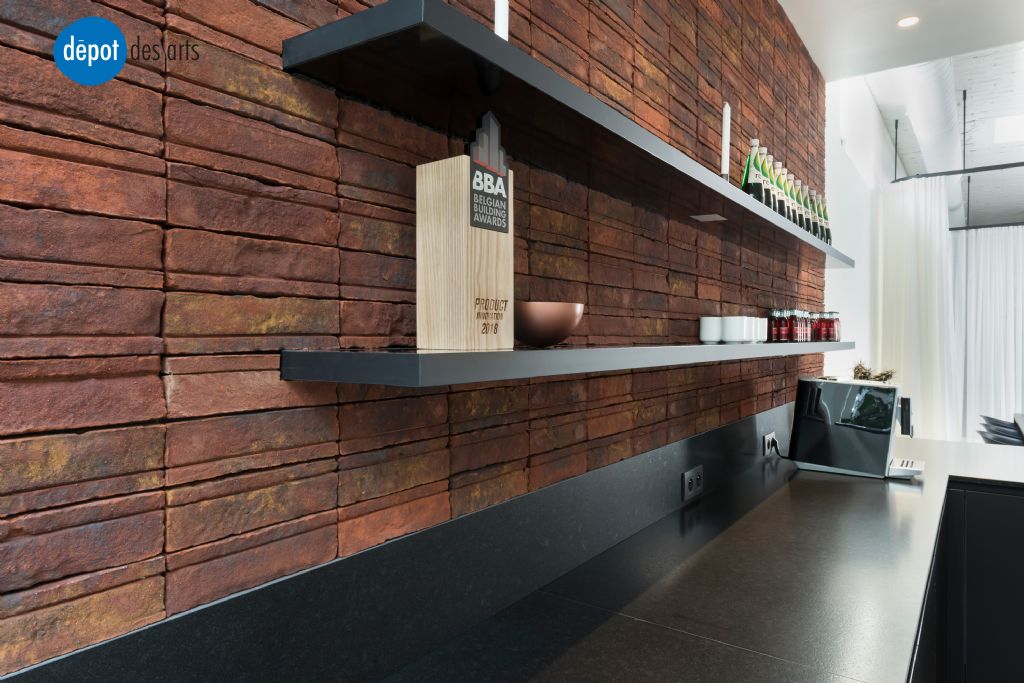 De Dubio-steen is overigens niet enkel geschikt als gevelsteen, ook voor het interieur kan de baksteen een grote meerwaarde zijn. Dat bewijst Roel Vandebeek zelf in zijn eigen designbureau Depot Roel Vandebeek, waar de ontwerper een muur achter een bar in Dubio heeft opgetrokken (foto’s).