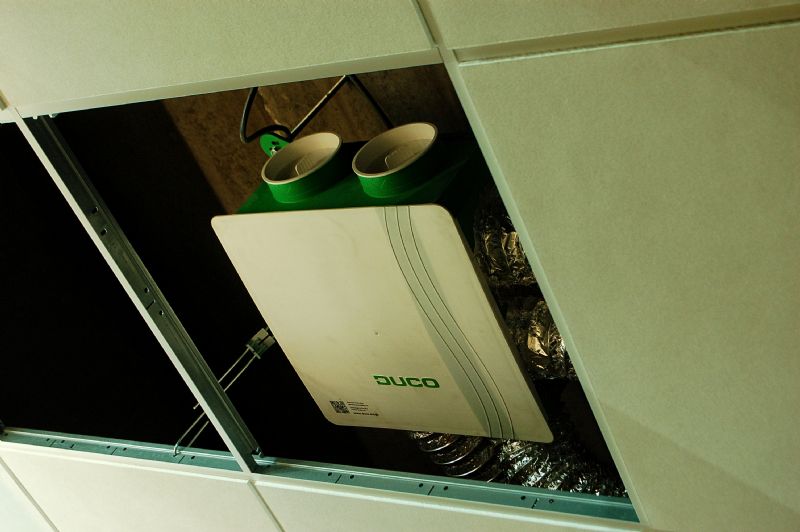 Naast de toevoer van verse buitenlucht is een even belangrijke factor de afvoer van vochtige en vervuilde lucht. In samenspraak met het architectenbureau heeft DM&S gekozen voor de slimme en stille afvoerventilator DucoBox Focus. De DucoBox Focus kwam als winnaar uit de bus dankzij zijn mogelijkheid om in elke kantoorunit afzonderlijk af te voeren wanneer nodig, en bovendien in de juist hoeveelheid. De installatie was ook vrij eenvoudig en er moesten geen extra complexe afvoerkanalen geïnstalleerd worden. “Deze zomer is het vrij warm geweest, maar op het kantoor was het altijd aangenaam. Wij zijn dus zeer tevreden,” klinkt het bij 3Architecten.