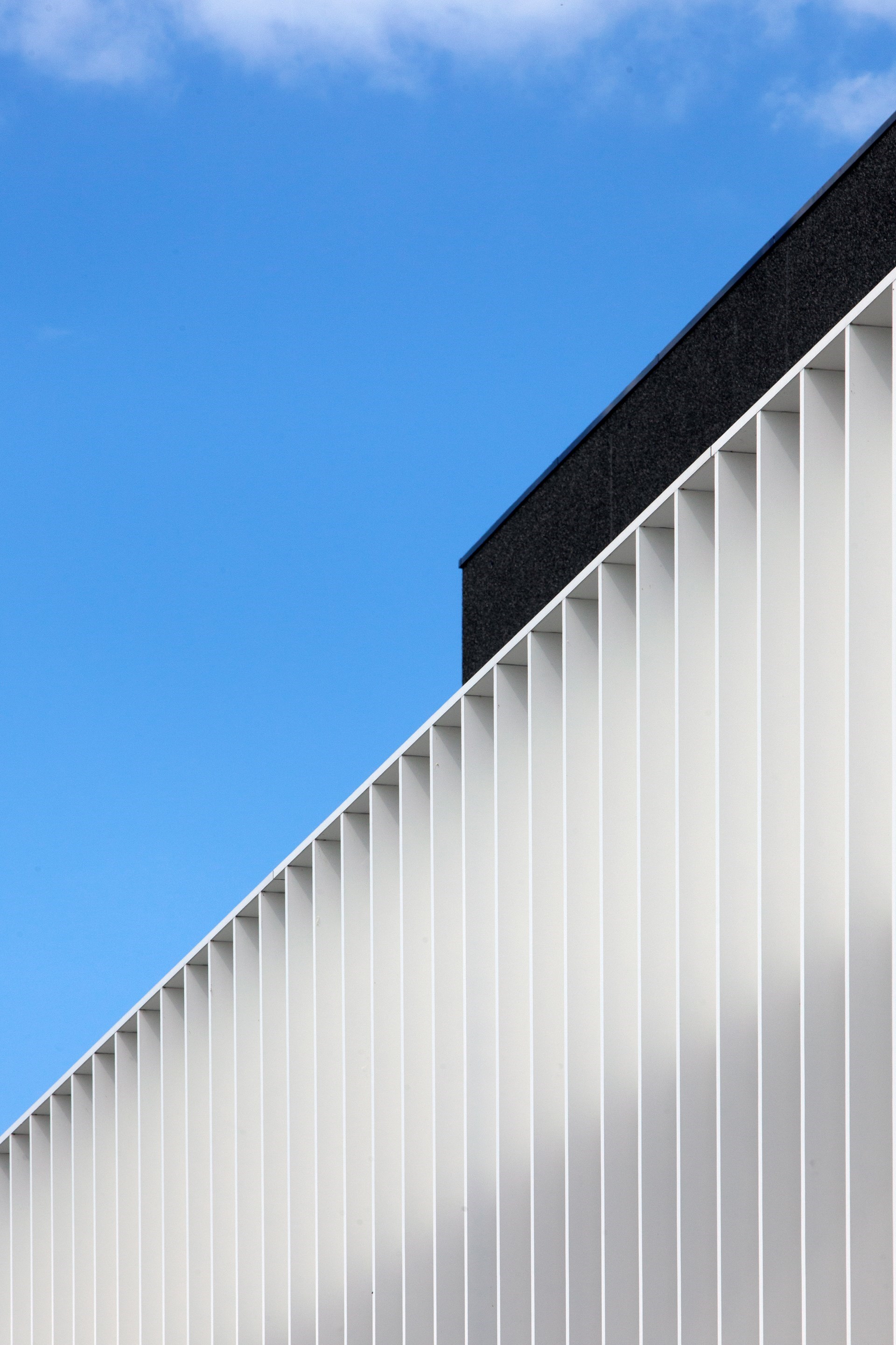 "Met de materiaalkeuze voor de gevel van het kantoorgebouw wilden we het gevoel van een zwevend bovenvolume creëren. Dit wordt benadrukt door het witte DucoSun Cubic frame en de lamellenstructuur die is toegepast op de vliesgevel op de bovenste verdieping. De naast elkaar geplaatste lamellen vormen daarbij een toepasselijke verwijzing naar het stapelen van papier. De DucoSun Cubic lamellen geven het kantoorgebouw een frisse uitstraling en creëren een mooie symbiose tussen het kantoorgebouw, het straatbeeld en de omgeving. Het balkon voor de vergaderruimte en de vide op de eerste verdieping zijn dankzij de aluminium lamellen dan ook letterlijk en figuurlijk de eyecatcher van het project.”, legt Jochen Kerkhofs uit.