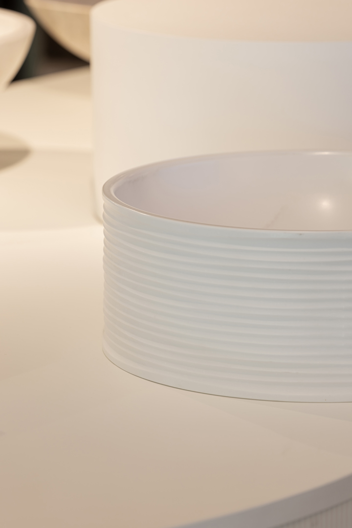 Het assortiment omvat ook Durasein solid surface waskommen, die design combineren met functionele hygiëne. Ze zijn glad, antibacterieel en eenvoudig schoon te maken. Elk model is verkrijgbaar in verschillende decors en kan op maat worden geconfigureerd, met opties voor montage, overloop en afwerking.