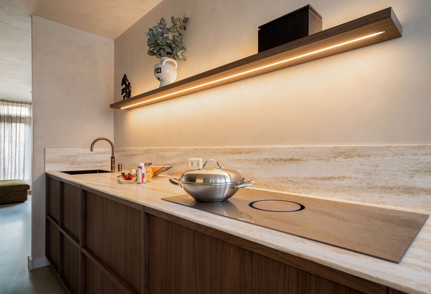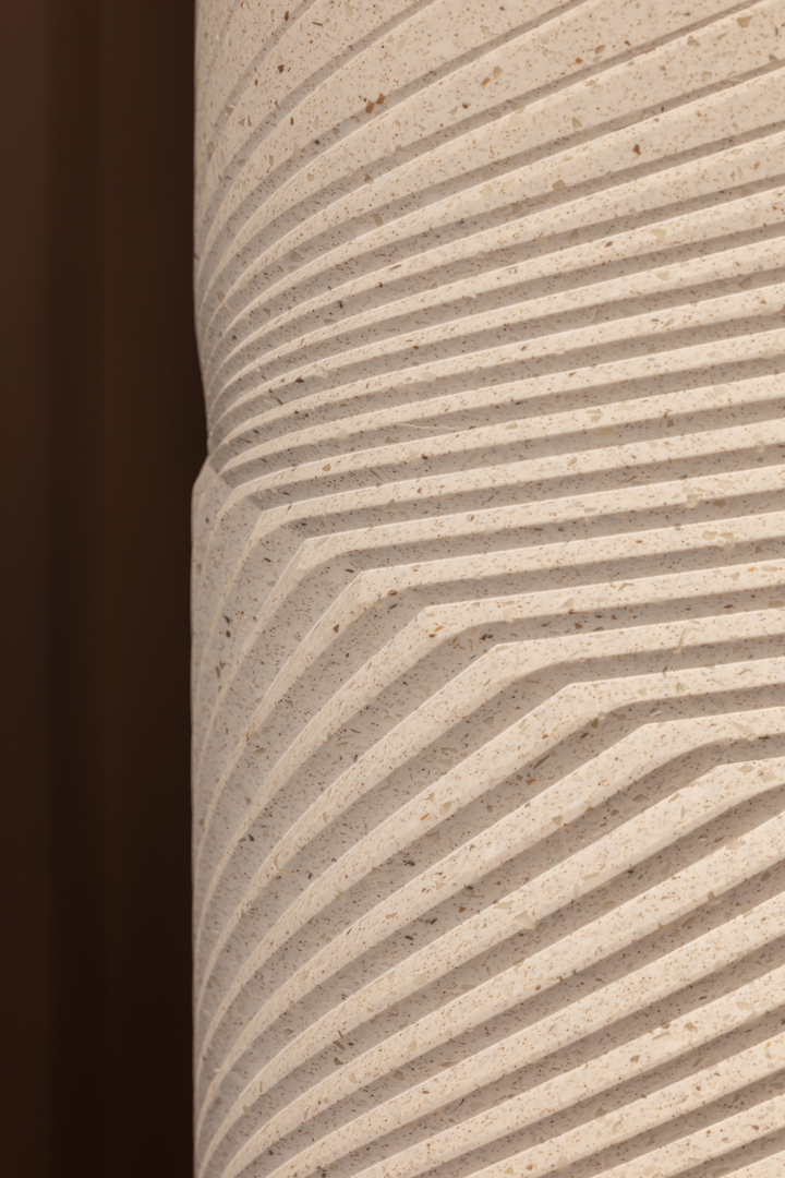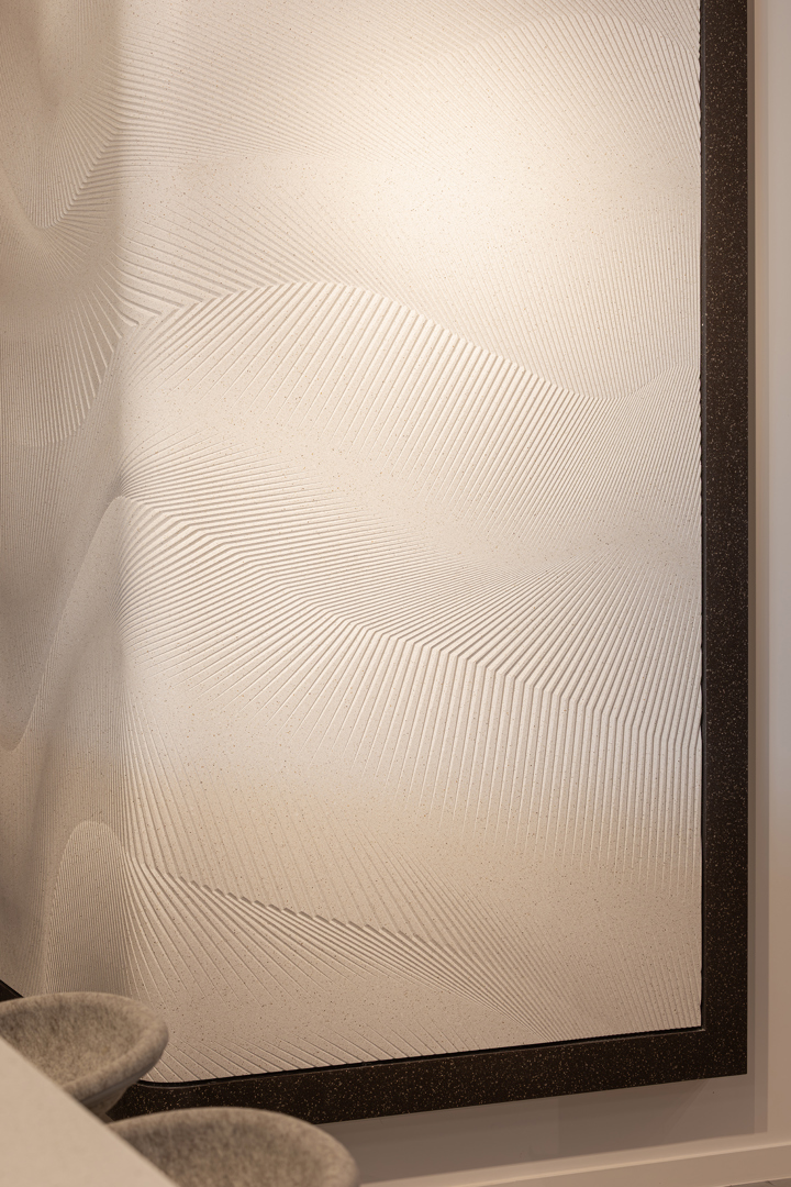 Binnen de collectie biedt DecoLegno ook Patternine aan: een techniek waarbij driedimensionale structuren in Durasein solid surface worden gefreesd. De patronen variëren van vloeiende, organische reliëfs tot strakke geometrische composities. In combinatie met licht ontstaan zo tactiele en visueel gelaagde oppervlakken die een interieur een uitgesproken identiteit geven.