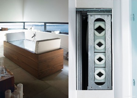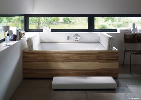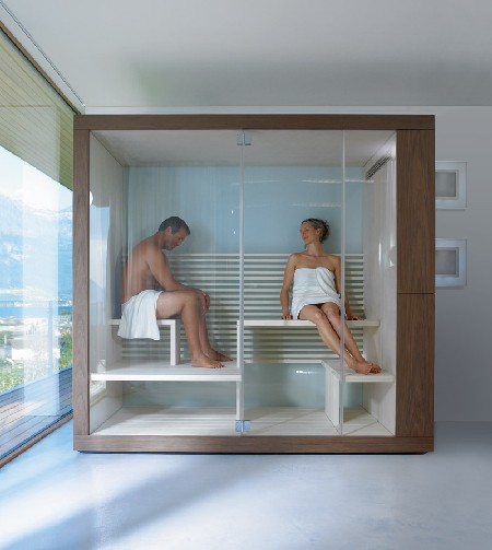 Door de houten omlijsting kan een perfecte overgang van bad- naar woongedeelte worden gerealiseerd. Hout is het verbindende element in de badkamer en brengt keramiek, baden, wellnessproducten en nu ook de sauna in een harmonieus geheel samen. Of in wit hoogglanzend gelakt, gekalkt eiken, kersenhout, Amerikaans kersenhout, Amerikaans notenhout, essen-olijfboom, palisander, ebben of macassar, alles is nu op elkaar afgestemd. De badkamer kan nu als spa worden gebruikt, als “privé spa”.