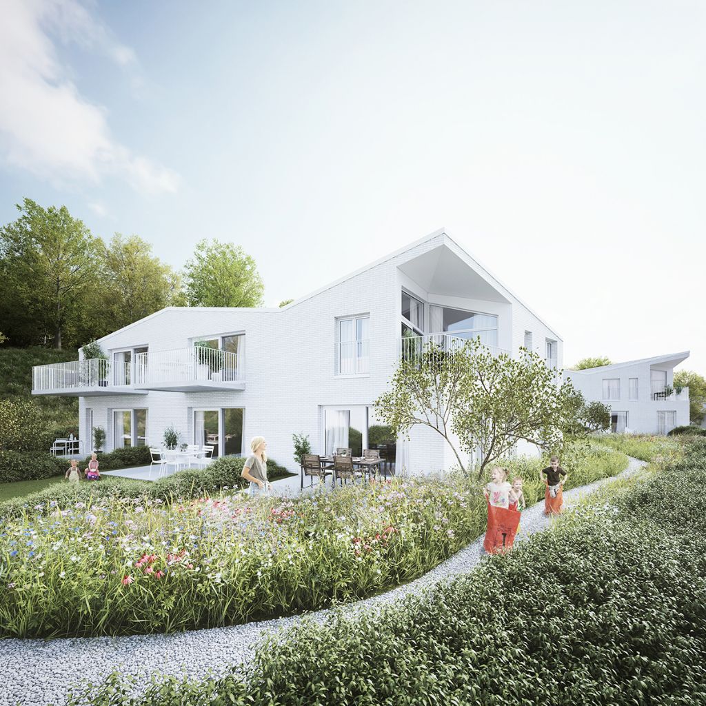 Custombuild lanceert dit vernieuwend concept binnen de projectontwikkeling zodat de bewoners op deze manier de opportuniteit krijgen om ecologisch verantwoord (samen) te leven. Het wooncomplex zelf, geflankeerd tegen een heuvel door het glooiende terrein en het spitsvondige architecturale ontwerp, bestaat uit drie woonvolumes met in totaal achttien woningen en een mooi geïntegreerde commerciële ruimte. Het woonvolume op de hoek bevat zes eengezinswoningen met twee verdiepingen en een eigen tuin. De andere twee volumes tellen in totaal twaalf appartementen.