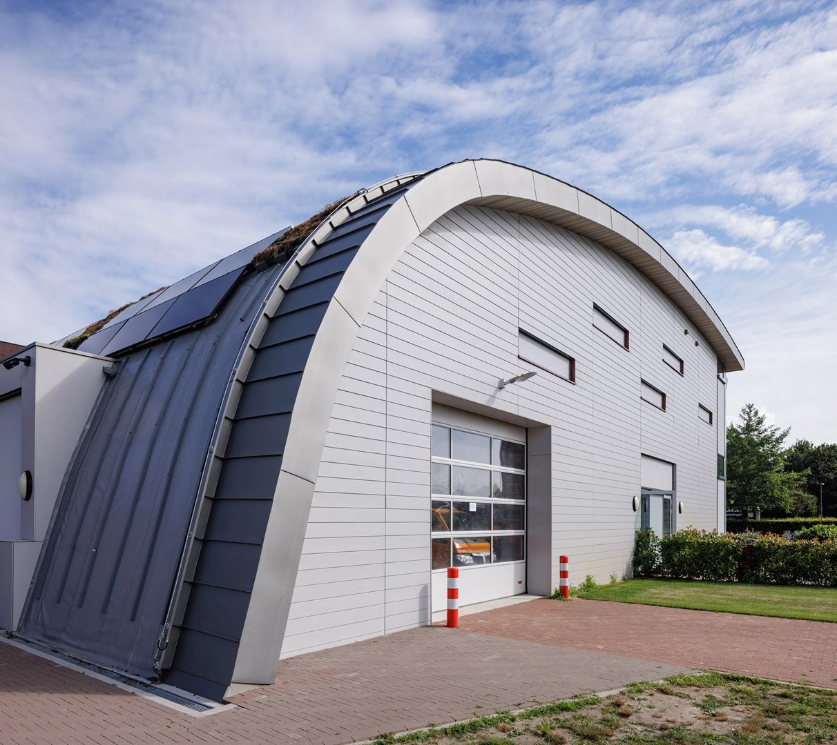 “Bovendien is het techniekgebouw volledig demonteerbaar. Alle gebruikte materialen kunnen worden hergebruikt, wat perfect past binnen de visie van circulariteit. Daarnaast ligt het hele gebogen dak vol zonnepanelen, waardoor het meer energie oplevert dan het verbruikt. De overige energie gaat naar het hoofdgebouw. Tussen en rondom de zonnepanelen zijn ook stroken met groendak voorzien die doorlopen tot op het maaiveld,” vertelt Jongen.