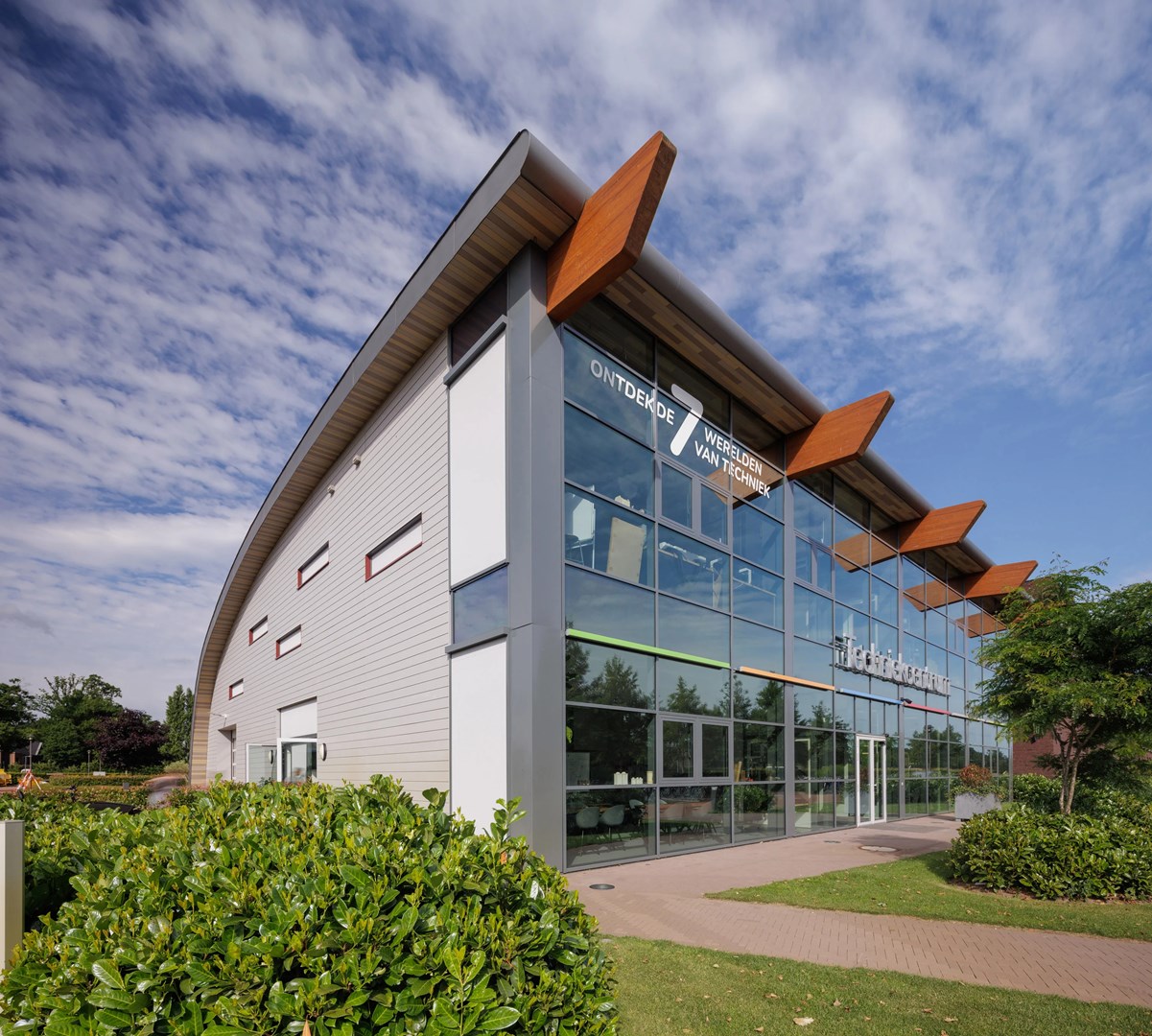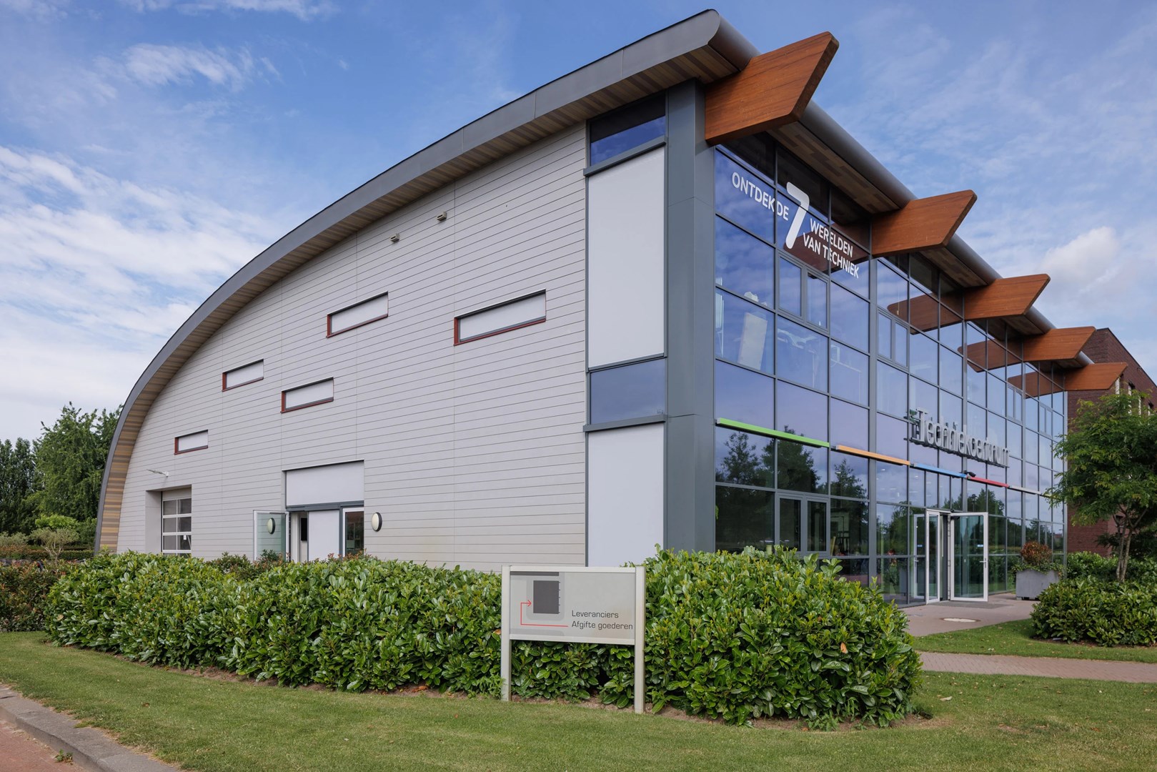 Het twee verdiepingen tellende gebouw kreeg een gebogen dak en een grote glaspui aan de voorzijde die zorgt voor een open en uitnodigende uitstraling. "We wilden techniek letterlijk in de etalage zetten. Het gebouw is daarom ontworpen om zowel techniek te tonen als praktijkonderwijs mogelijk te maken," aldus Jongen.