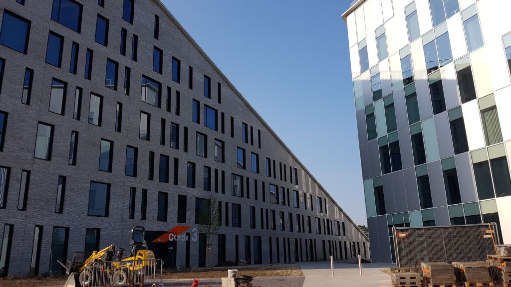 En de definitieve vorm tekent zich stilaan af tegen de horizon. In 2013-2014 werd het gebouw Corda 1 nog gerealiseerd, de centrale spil van de Campus met op het gelijkvloers enkele commerciële ruimtes. Recent werden twee bijkomende kantoorgebouwen opgeleverd: Corda 2 en 3. Onder die gebouwen ligt ook een parking van 247 plaatsen. Het architectenbureau eld ontwierp Corda 2 en 3 en liet zich daarbij inspireren door de ligging ervan, tussen de gebouwen Corda 1 en 4. “We wouden twee gebouwen creëren met elk een eigen karakter en tegelijk een visuele overgang realiseren tussen de volledig glazen gevel van Corda 1 en de meer gesloten gevel van Corda 4”, zegt Geert De Clerck, architect bij eld. “Corda 2 kreeg net als Corda 1 een vliesgevelsysteem, maar er werd geopteerd om de beglaasde delen af te wisselen met enerzijds cassettes in aluminiumgrijs en anderzijds gezuurde beglazing. Het buitenschrijnwerk van Corda 3 is dan weer klassieker, net als de gevel met lichtgrijze steen, zodat het gebouw een mooie overgang vormt tussen Corda 2 en 4.”