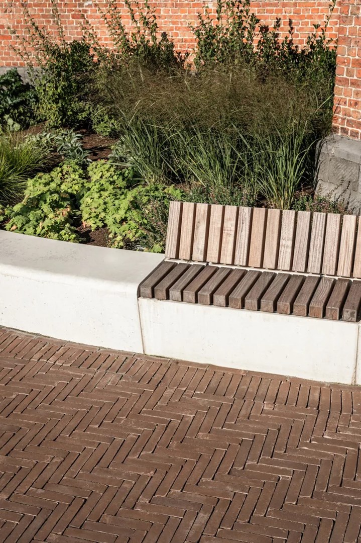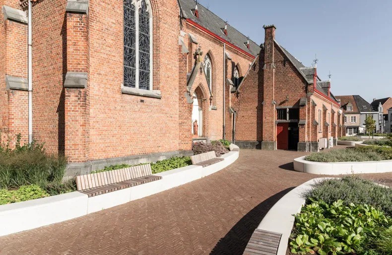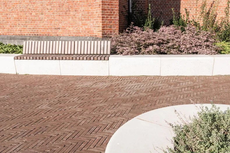 Naast de technische voordelen van de kleiklinkers en het waterdoorlatende systeem, biedt het vernieuwde plein ook een duidelijke esthetische meerwaarde. De gekozen materialen, in combinatie met het nieuwe ontwerp van het plein, zorgen voor een moderne, strakke uitstraling die perfect past bij de historische context van Meulebeke. Het ontwerp respecteert de bestaande architectuur van de gemeente, terwijl het toch eigentijds en functioneel aanvoelt. De kleiklinkers dragen bij aan deze esthetiek door hun natuurlijke kleuren en texturen, die zowel klassiek als tijdloos zijn. Ze geven het plein een warme en uitnodigende uitstraling, wat de algehele beleving van de ruimte verbetert. Het is een plek geworden waar inwoners graag vertoeven, niet alleen voor de wekelijkse markt, maar ook voor dagelijks gebruik.