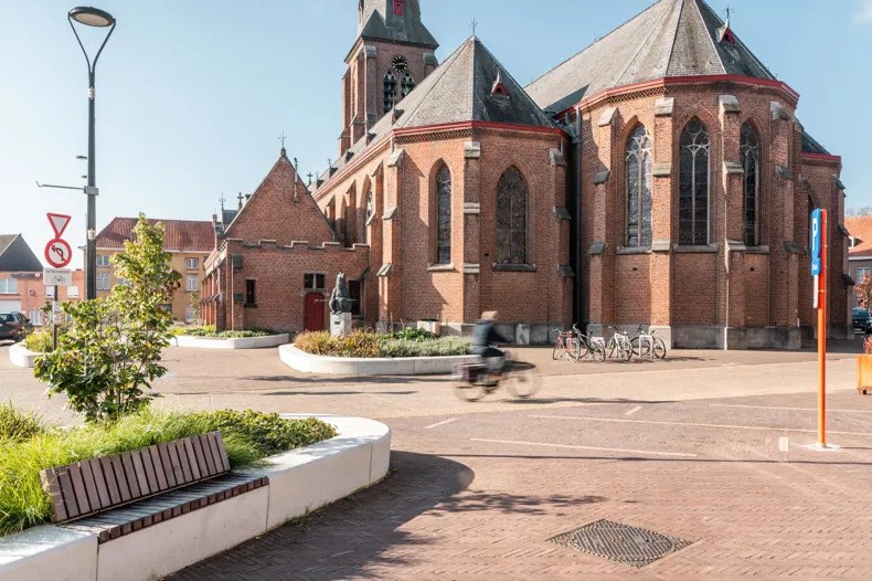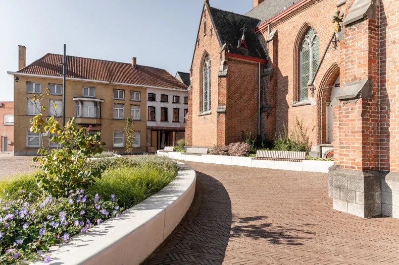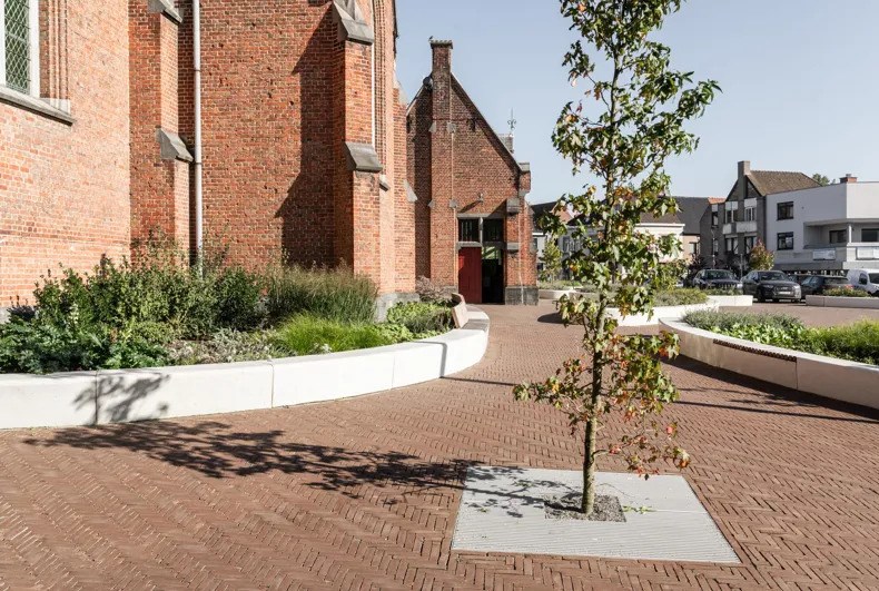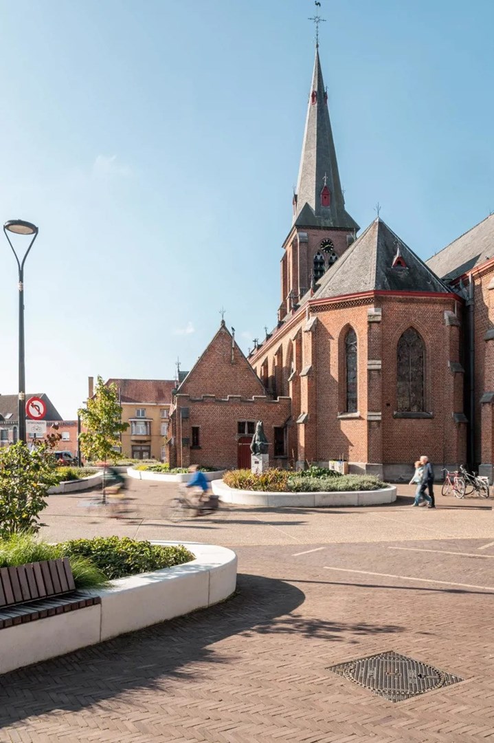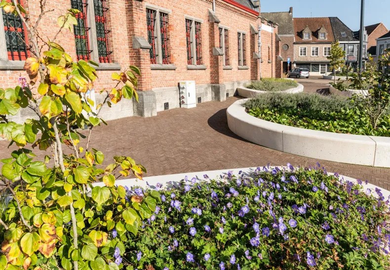 In het kader van het herinrichtingsproject van het marktplein in Meulebeke was een van de hoofddoelen het optimaliseren van waterbeheer zonder afbreuk te doen aan de esthetische en functionele waarde van het plein. Door te kiezen voor een mix van waterdoorlatende materialen en groene zones, heeft de gemeente een duurzame oplossing gevonden die het regenwater efficiënt beheert en natuurlijk laat infiltreren.