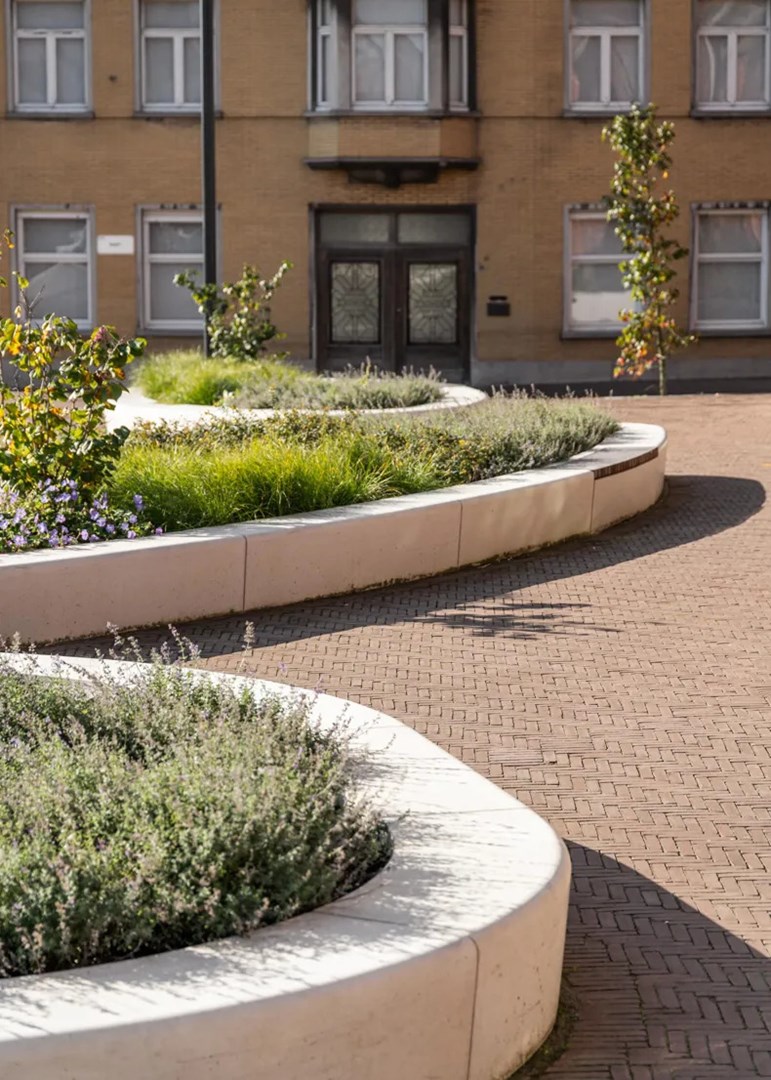 Het nieuwe ontwerp biedt nu veel meer ruimte voor natuurlijke elementen zoals bomen, struiken en grasvelden, afgewisseld met verharde paden. Deze verandering draagt niet alleen bij aan de leefbaarheid en ecologie van het plein, maar verhoogt ook de esthetische aantrekkingskracht en creëert schaduwrijke plekken voor verkoeling tijdens warme zomerdagen. De ellipsvormige betonmodules met geïntegreerde groene zitbanken voegen dynamiek en speelsheid toe aan het plein.