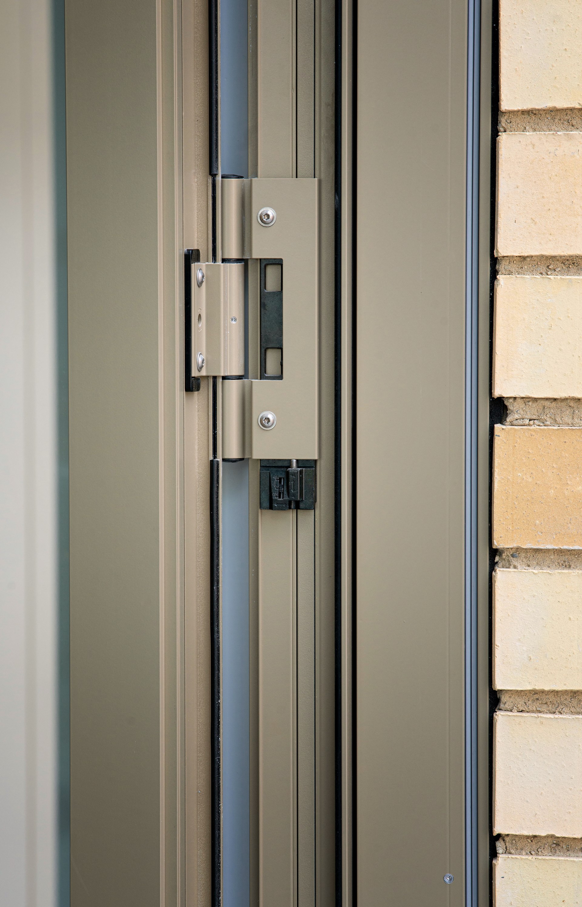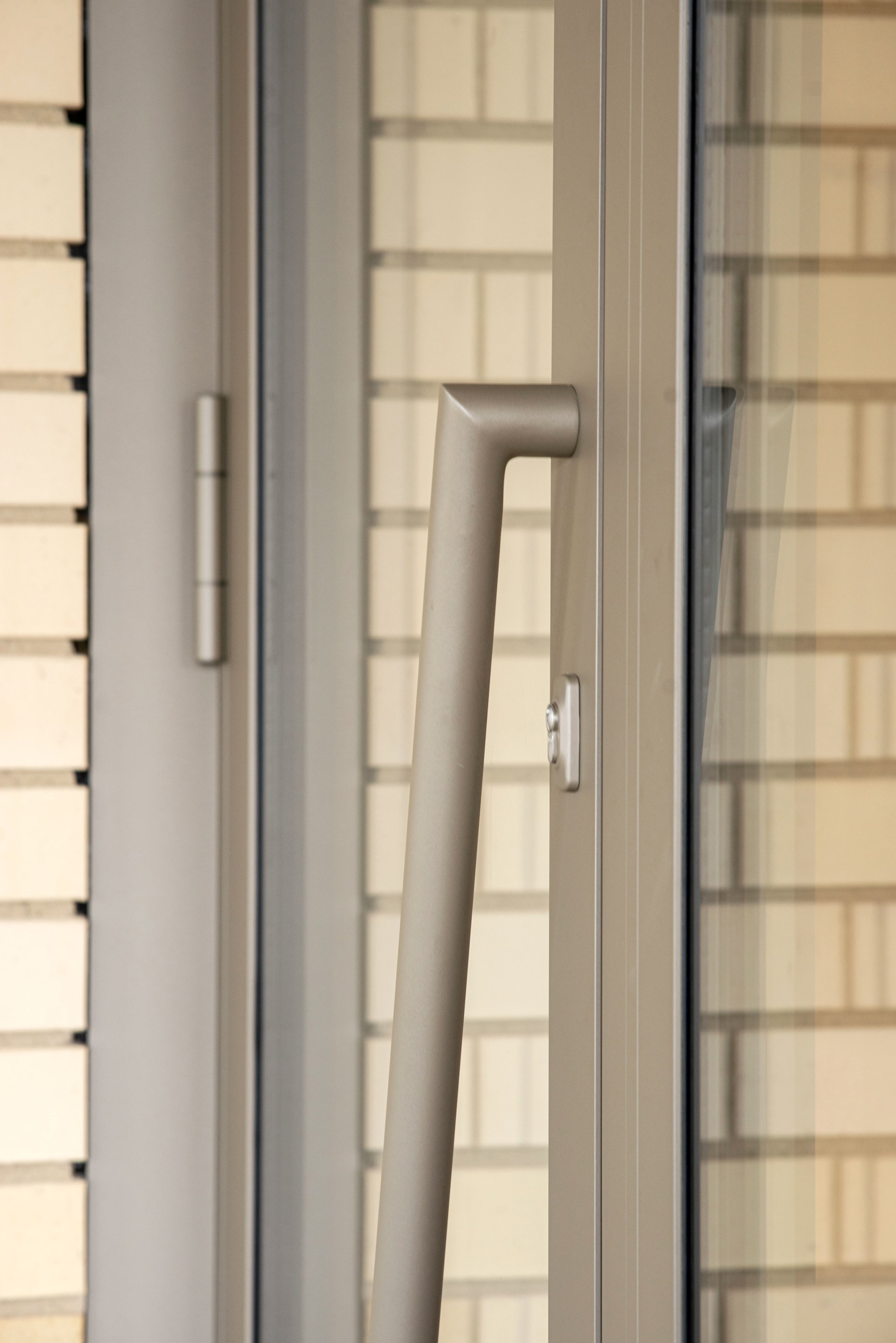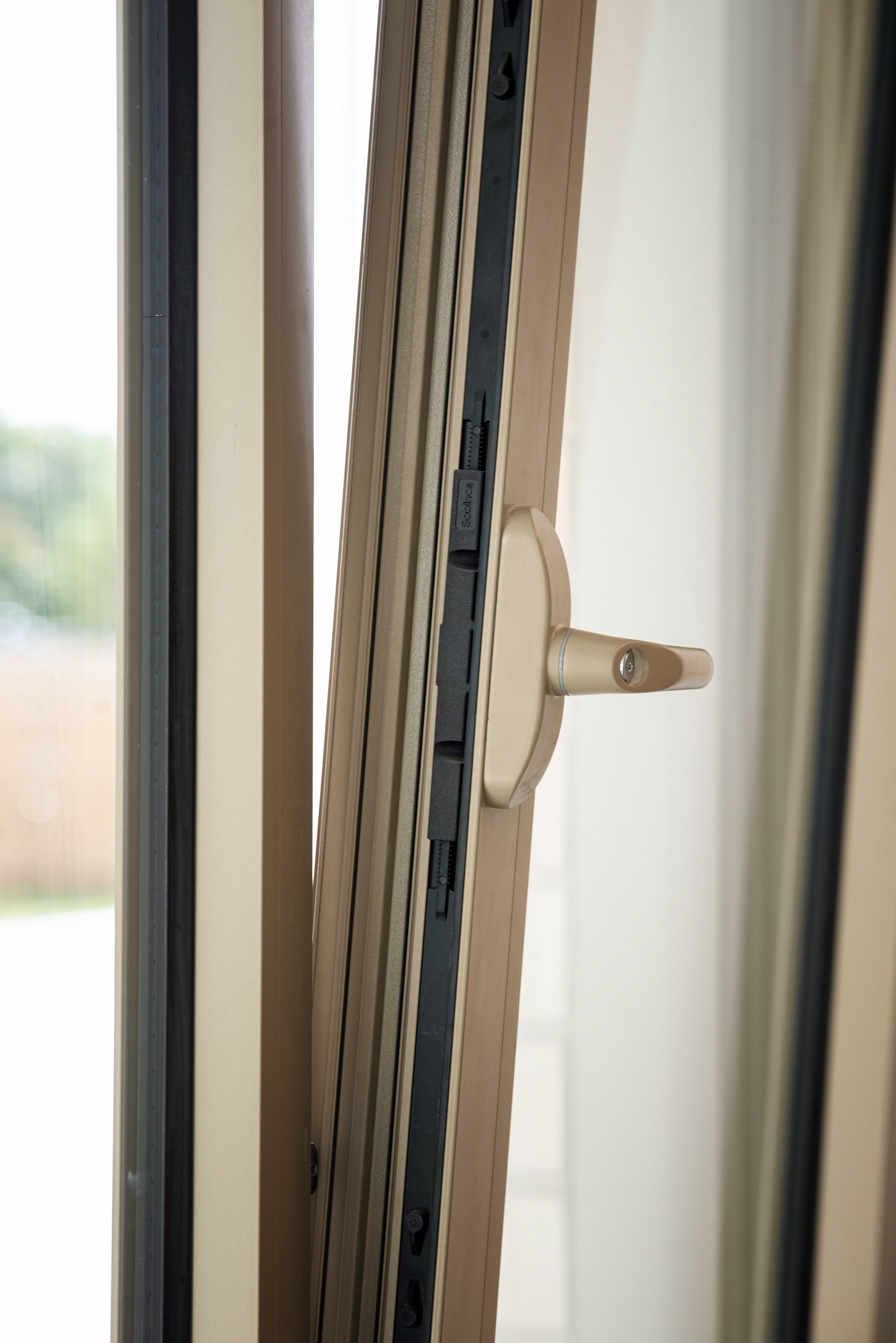 Zowel de raamprofielen als het beslag en de scharnieren zijn uitgevoerd in dezelfde kleur 8C32AN. Deze licht bronzen poederlakkleur is een mooi alternatief voor echte anodisatie brons. Het geheel resulteert in een prachtige en uniforme uitstraling.