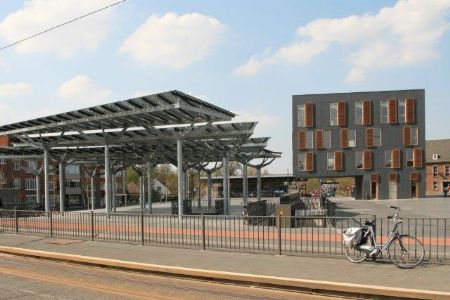 Behalve de luifel is ook het multifunctionele passieve gebouw een belangrijke eyecatcher op het nieuwe stadsplein. Dit is onder meer te wijten aan de tien meter lange geveluitkraging, die ondersteund wordt door een stalen constructie die aan de betonconstructie van de ondergrondse parking verankerd is. Het is onder deze uitkraging dat fietsers en auto’s de ondergrondse parking in- en uitrijden. Het zuidelijk georiënteerde gebouw, dat onder meer moduleerbare kantoren (units van 36 m² tot 270 m²), een Stadscafé met terras en enkele stadsdiensten huisvest, maakt integraal deel uit van het nieuwe stadsplein. De combinatie van het nieuwe gevelproduct van Eternit in de vorm van grijze vezelcementplaten type Equitone ( tectiva ) TE 80 in verschillende formaten en slanke houten blokramen geeft het dezelfde uitstraling als het plein: stedelijk met kleinschalige accenten. Bij de realisatie van het markante complex streefde Abscis Architecten de passiefhuisstandaard na. Het markante gebouw werd gerealiseerd volgens de principes van de Trias Energetica en verbruikt maar liefst 75 procent minder energie dan een traditioneel gebouw. Abscis slaagde erin om moderne en hedendaagse architectuur optimaal te verenigen met een duurzaam totaalconcept en realiseerde zo een complex dat symbool staat voor de vooruitstrevendheid van dit stedelijk ontwikkelingsproject. “Het passieve kantoorgebouw is inmiddels gecertifieerd en is in feite een ‘nulenergiegebouw met overschot’,” vertelt Lieven Louwyck van Abscis Architecten. “Met de opbrengst van de fotovoltaïsche luifels (114623 kWh/jaar) voldoen we ruimschoots aan de energievraag van het passiefkantoor (93280 kWh/jaar). Met de pv-cellen kunnen we ook 27 procent van de totale energiebehoefte voor de verlichting en de technieken op de parking voorzien (426000 kWh/jaar). Momenteel zijn ze echter aangesloten op het passiefcomplex, en dus is er een theoretisch overschot van circa 23 procent.”