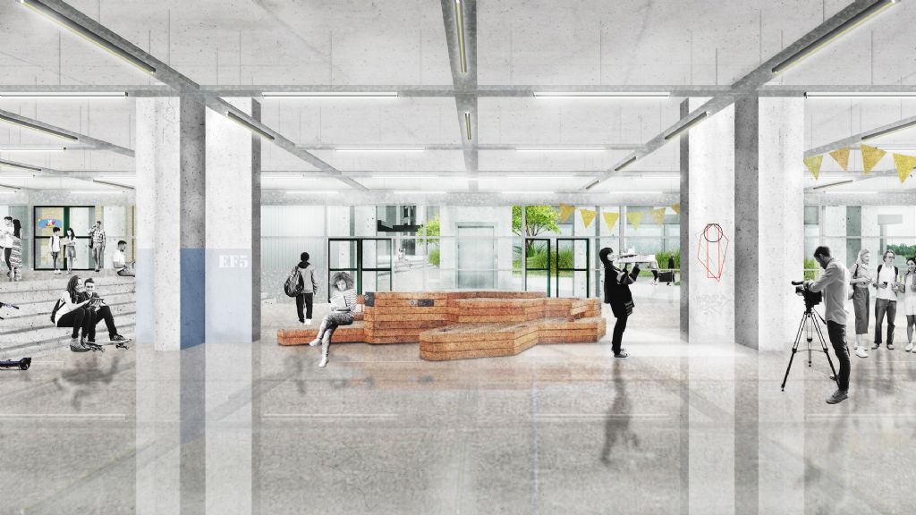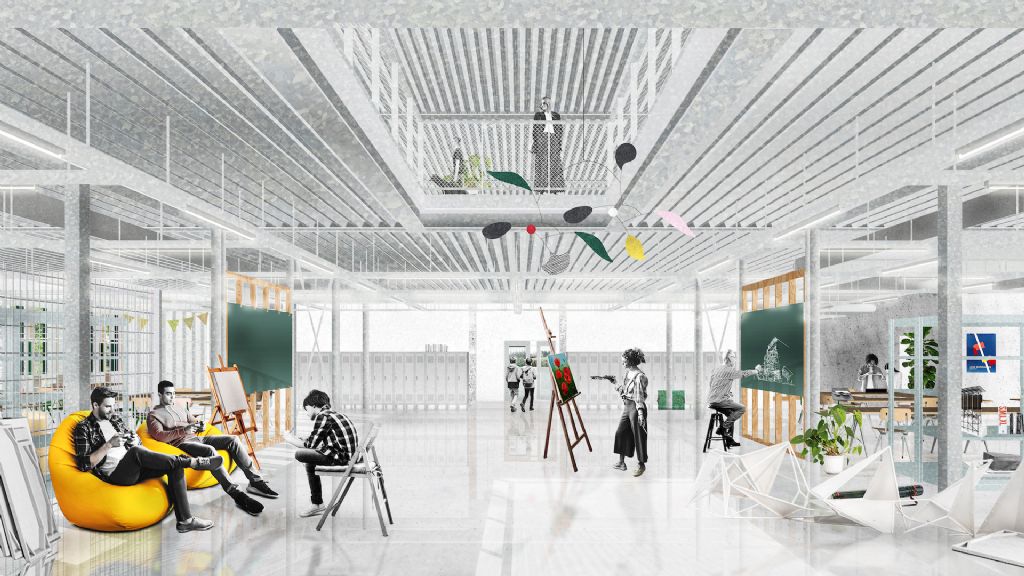 De pedagogische visie van de school werd vertaald in een ontwerp zonder dirigerende gangen en met de mogelijkheden van “plug and play” voor de theorie- en praktijklokalen. De kolom- en balkenstructuur in staal geeft een heldere modulariteit, maakt de werking continu aanpasbaar en stimuleert de flexibele leeromgeving. Deze ruimtelijke opzet maakt de leefwereld van de leerlingen aanpasbaar, fluïde en is voorzien op andere mogelijke toekomstige scenario’s. Alle klas- en praktijklokalen worden georganiseerd aan de gevels van het gebouw. Hierdoor ontstaat er centraal een open ruimte die zeer flexibel kan worden ingevuld als open atelier voor werkhoeken, leerzones, groeitafels, creatief labo, leerplekken, kleinschalige arena’s,... Theorie- en praktijklokalen worden bewust op hetzelfde niveau geplaatst. Dit om de interactie tussen de verschillende vakken, leerkrachten en leerlingen te versterken.