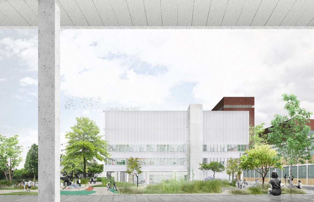 In het winnende wedstrijdontwerp van import.export Architecture uit Antwerpen en BOT architektuurcollectief uit Hasselt werd er vanuit een masterplan voor de volledige kunstencampus geopteerd voor een helder en compact gebouw. Door zijn specifieke inplanting laat het gebouw zo veel mogelijk open ruimte voor de speelplaats, en zoekt het interactie met de nabij liggende Demer en het Kapermolenpark. De speelplaats zal naar ontwerp van Studio Basta uit Kortrijk sterk onthard en vergroend worden en verschillende speel-, sport en chillzones bevatten. De creativiteit van de leerlingen wordt ingezet om de sport- en speelzones mee vorm te geven met kleurrijke geometrische composities.