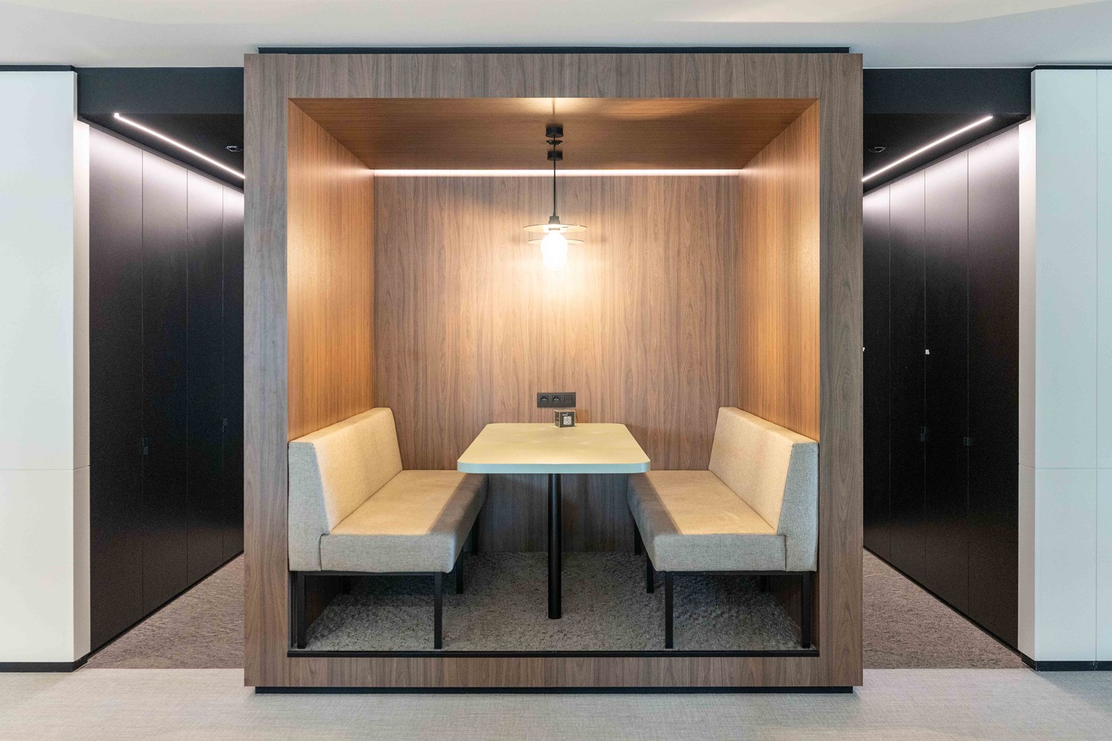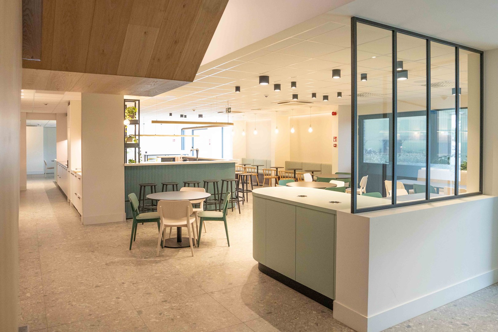 De renovatie omvatte niet alleen technische verbeteringen, maar creëerde ook meer ruimte voor welzijn en samenwerking. Wanneer je door het gebouw wandelt, valt meteen de rust en stilte op. Een weloverwogen indeling met akoestische scheidingswanden zorgt voor een open gevoel én biedt tegelijk alle nodige privacy. Een uitgebreide seminarieruimte laat toe om grotere groepen makkelijk samen te brengen.