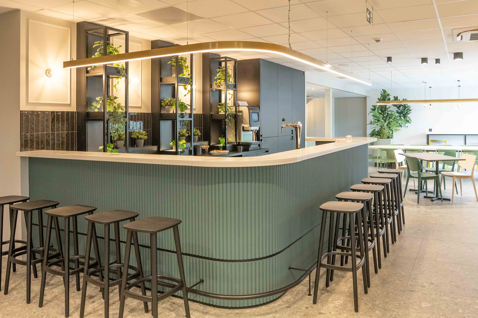 Daarnaast werd een nieuw lunch- en ontspanningsgedeelte, onder de noemer ‘Harol Café’, boven de doopvont gehouden. “We wilden een plek waar medewerkers samen komen, niet alleen om te werken, maar om te ontspannen en ideeën uit te wisselen,” vertelt Annick. “Af en toe aan de bar iets drinken of eten en wat stoom aflaten vinden we erg belangrijk. En in de aanpalende fitnessruimte sporten we die extra calorieën er nadien wel af.”
