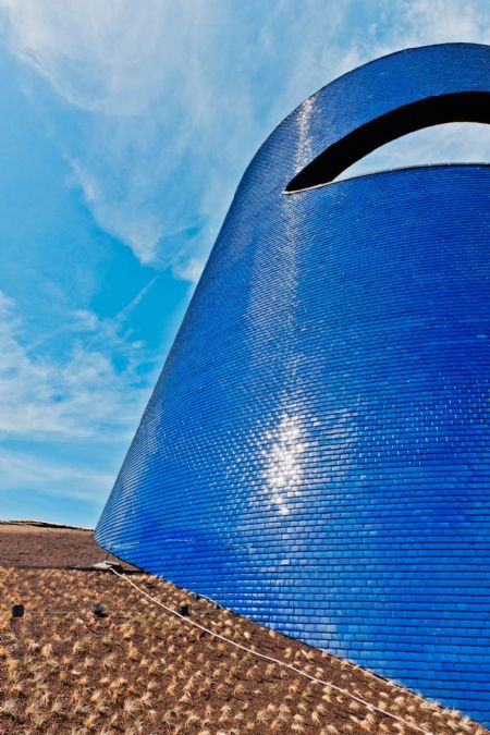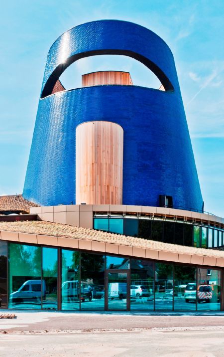 Het materiaalgebruik staat dan ook in het teken van deze duurzame visie, met als meest visuele representant de opmerkelijke azuurblauwe tegelpannen, die de toren aan de hoofdingang van het centrum al van ver zichtbaar maken. De kleidakpannen zijn onderhoudsvriendelijk, blijvend mooi en stevig. De dakdekker gebruikte maar liefst 770 m² Koramic tegelpannen van het type Aléonard Patrimoine. De betegeling nam uiteindelijk twee maanden in beslag.