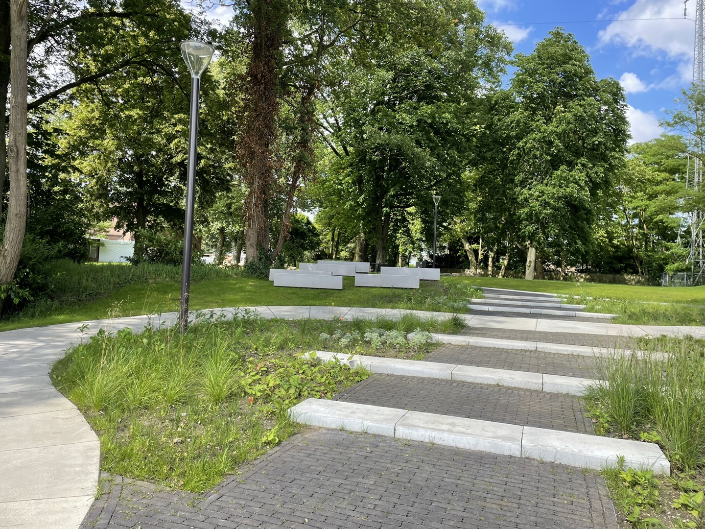 Inwoners en bezoekers van Houthalen-Helchteren kunnen sinds vorig jaar genieten van een nieuw, groen plekje in het centrum. Landschapspark De Pastorie presenteert zich als een groene oase van rust tussen het nieuwe administratief centrum en de pastorie, verbonden door een bijzonder prefab betonnen wandelpad. “Het pad aanleggen in een helling was een echte uitdaging”, vertelt Luc Vandebeek, CEO van ecobeton water technologies.